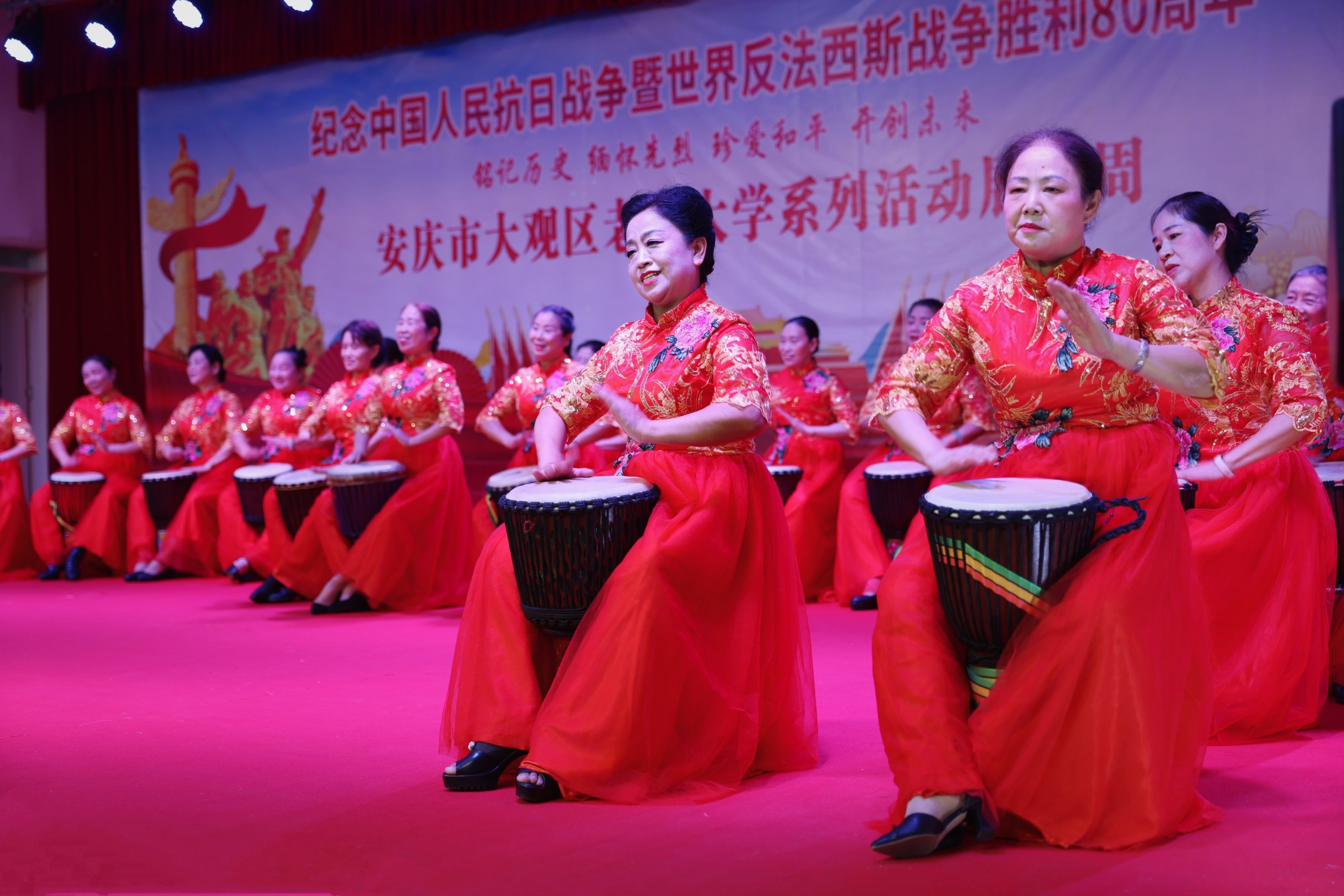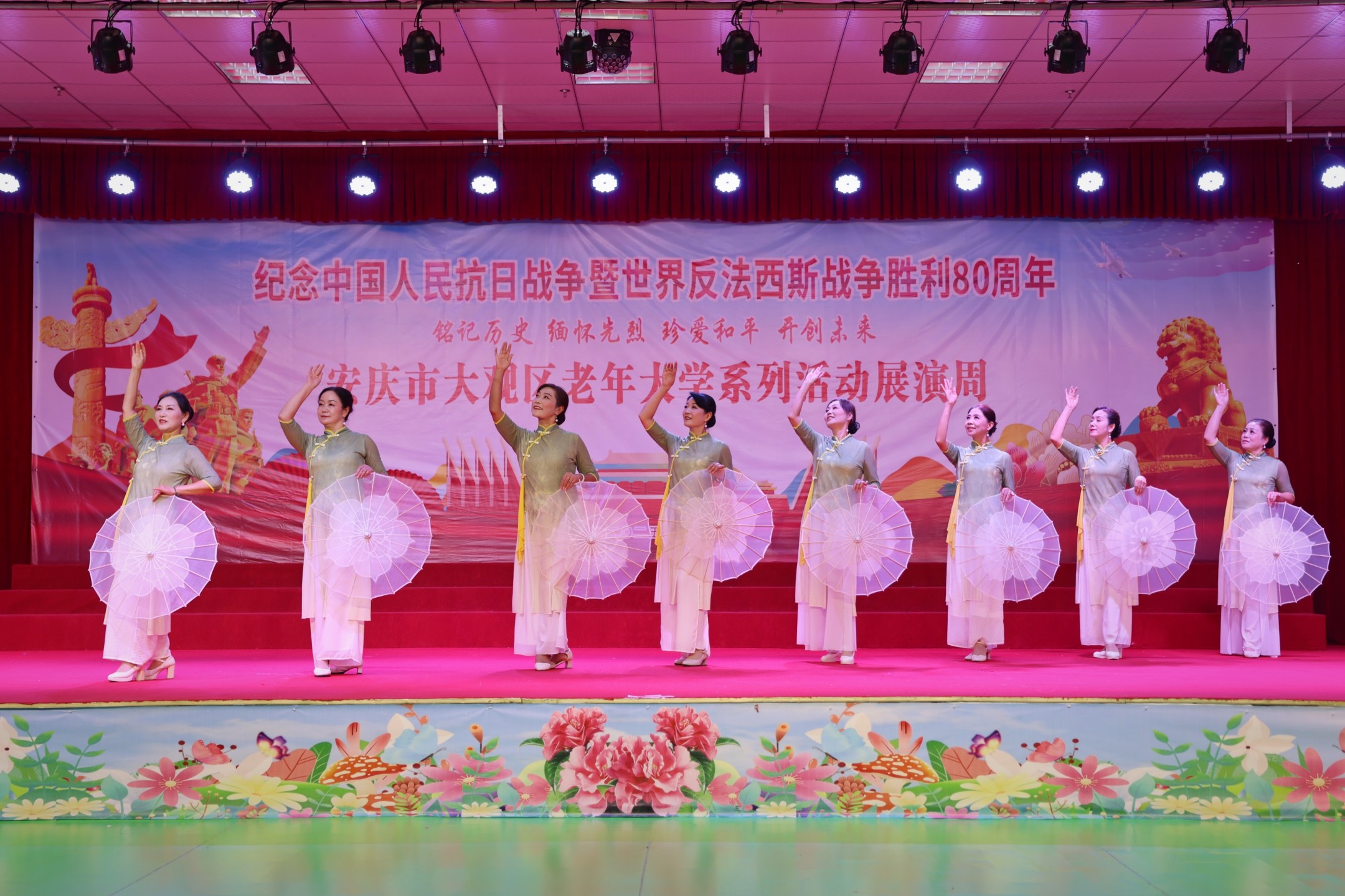 在全国各地纪念抗战胜利80周年之际,由中共安庆市大观区委组织部(老干部局)、中共安庆市大观区委宣传部主办,安庆市大观区老年大学承办,纪念中国人民抗日战争暨世界反法西斯战争胜利80 周年“铭记历史 缅怀先烈 珍爱和平 开创未来”主题文艺展演周,于9月23日下午正式拉开帷幕。活动持续至9月25日,音乐系、舞蹈系、书画系等八大教学系师生历时三个月精心打磨61个原创节目将在展演周期间展出,用银发赤忱共筑精神丰碑。