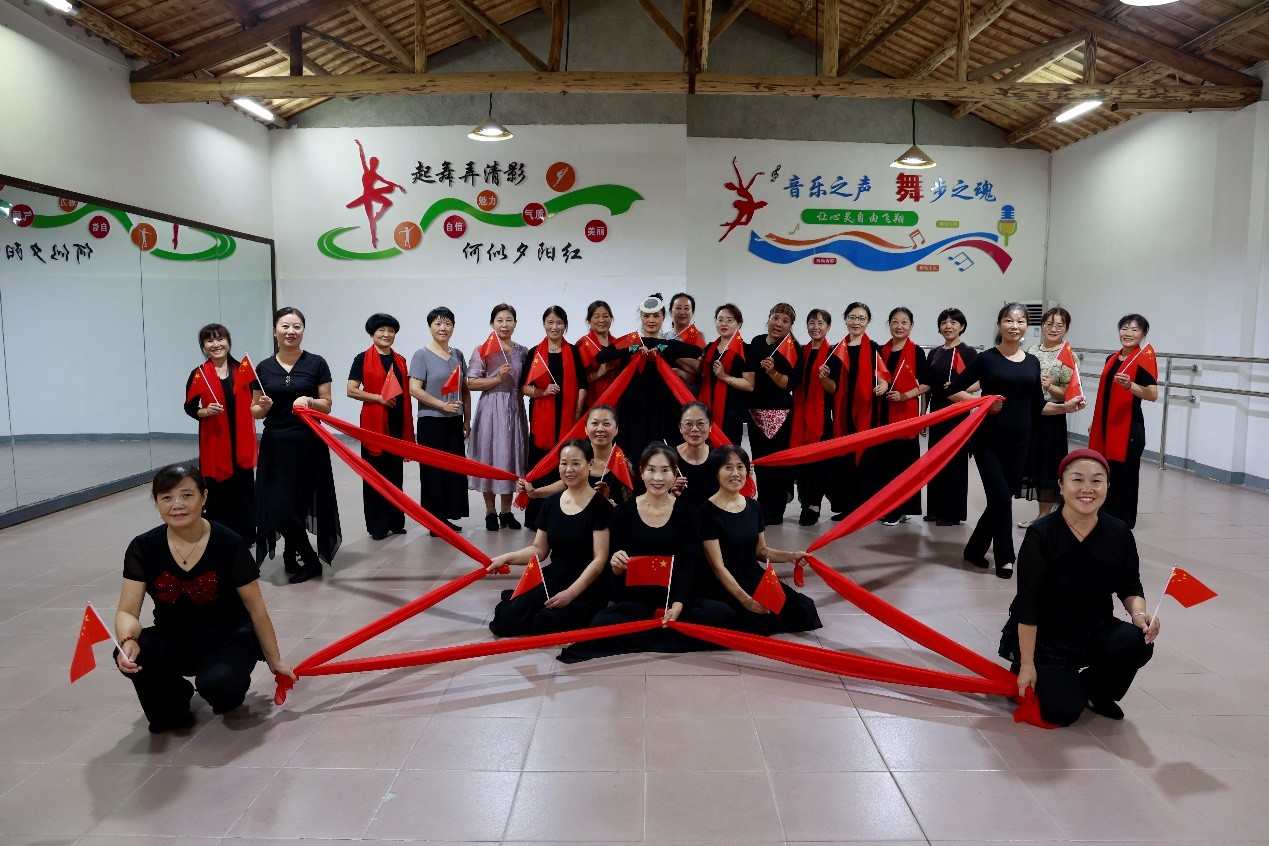 民族舞提高班、戏曲身段班学员们则结合教学,开展了“夕阳红美舞献祖国”活动。在《没有共产党就没有新中国》的旋律中,她们翩翩起舞,挥舞着手中的五星红旗,用肢体语言诉说着对祖国的热爱,让在场的每一个人都深深沉浸其中。