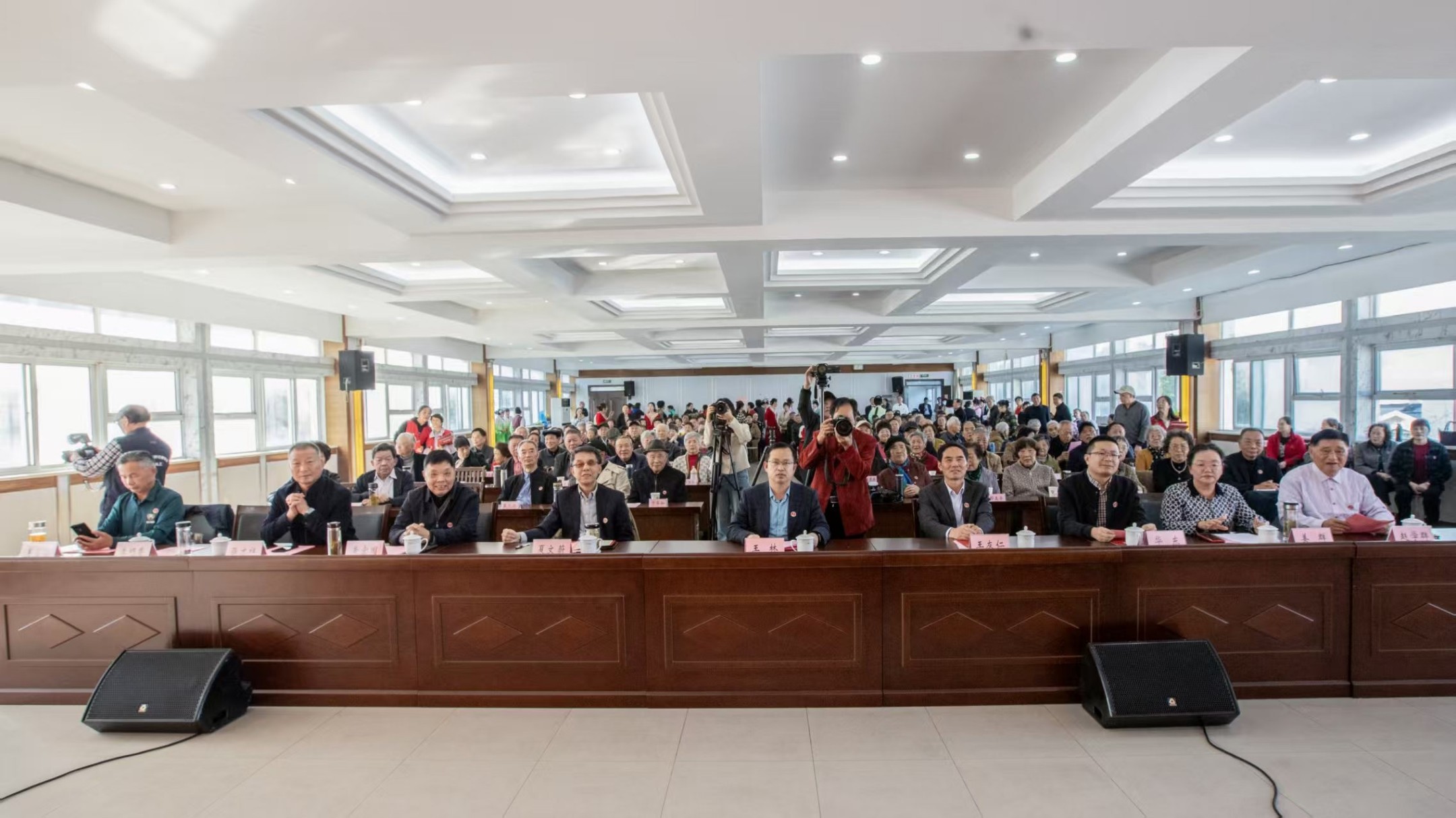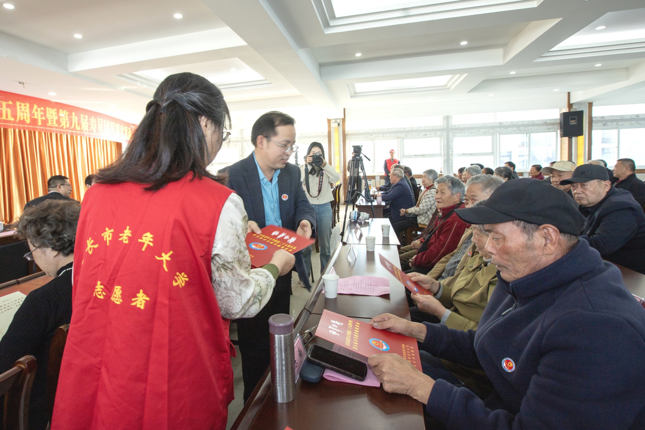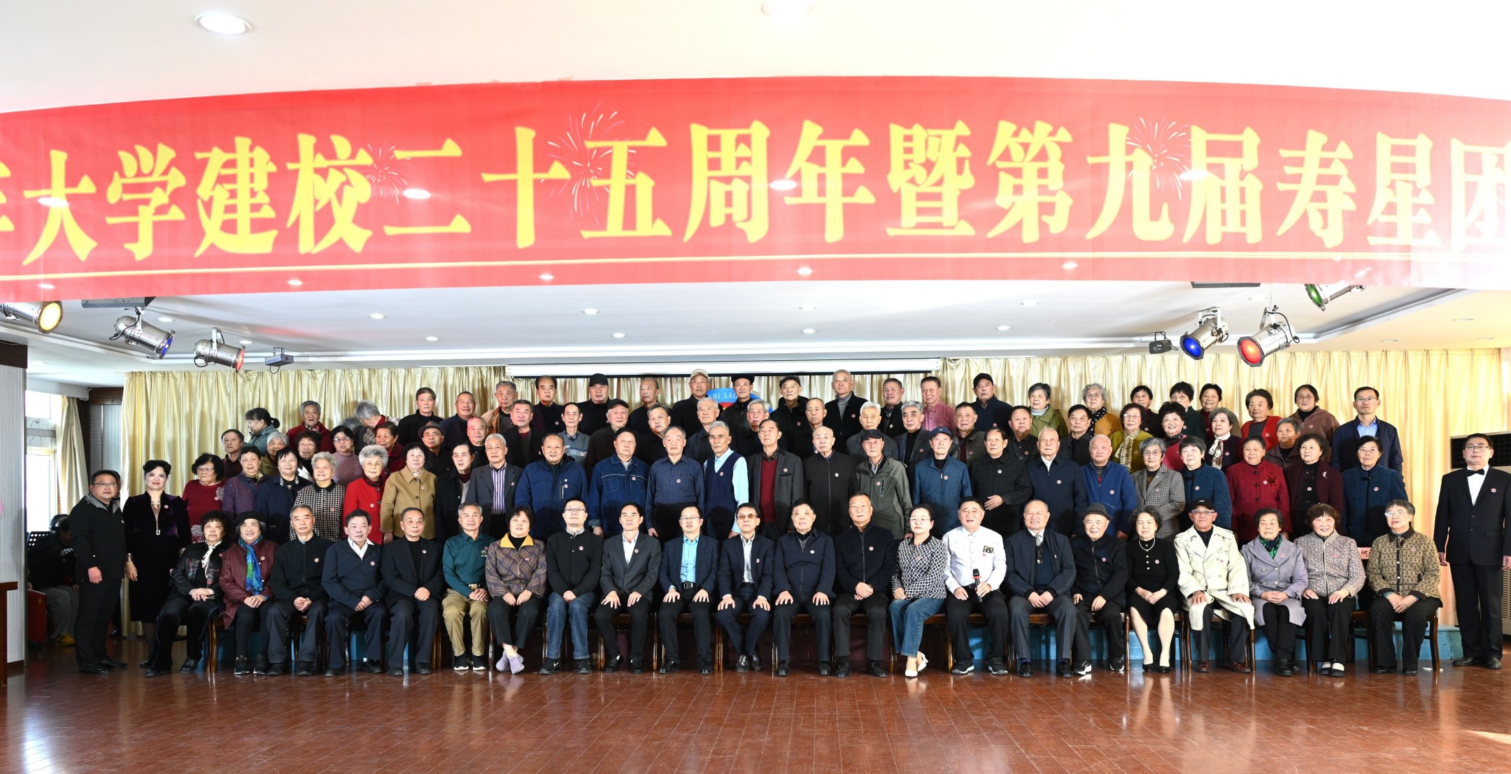 活动伊始,学校志愿者细心地为近百名寿星佩戴上校徽,市领导与校领导一同走上台,和老人们并肩合影。