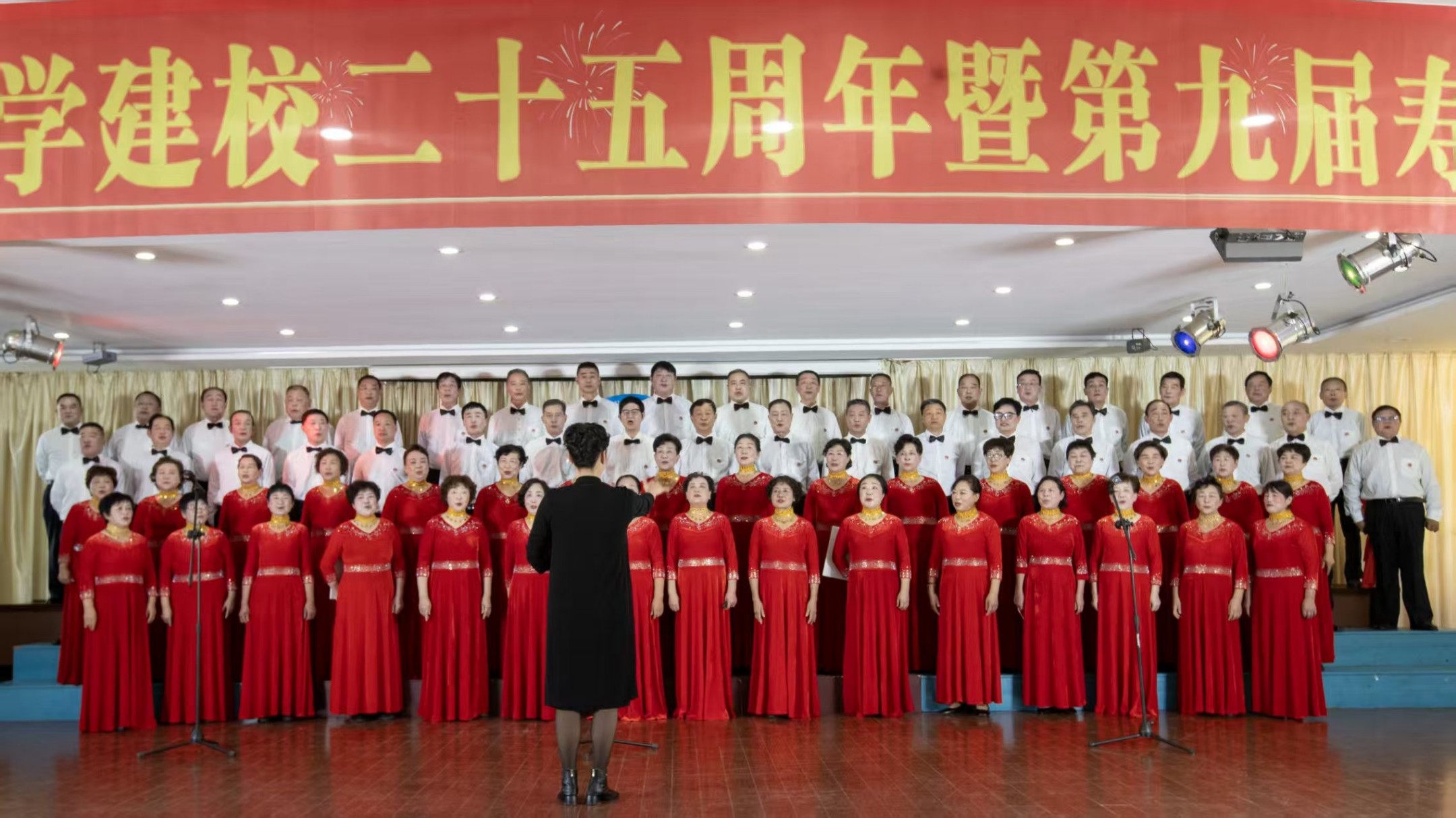 最后是学员们自编自演的文艺演出登场,瞬间把现场氛围拉到了新高度。音乐二班的学员们率先唱响校歌——这首歌由著名作曲家何仿作曲,老年大学领导集体填词,熟悉的旋律一响起,台下便满是共鸣。随后,大合唱、朗诵、舞蹈轮番上演,每一个节目都透着学员们的热情,尤其是黄梅班的《五女拜寿》,更是让整场演出的气氛热烈到了顶点。