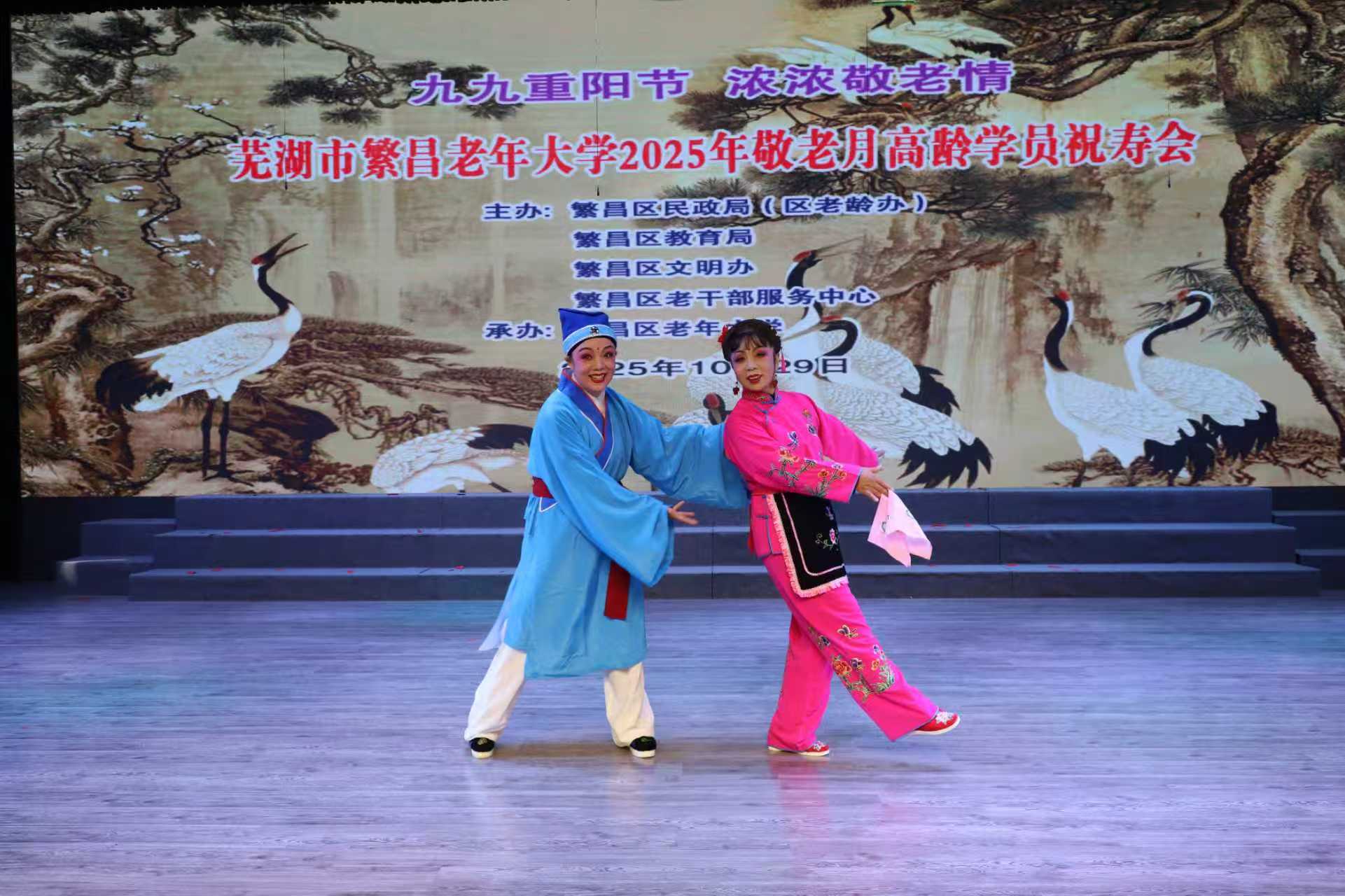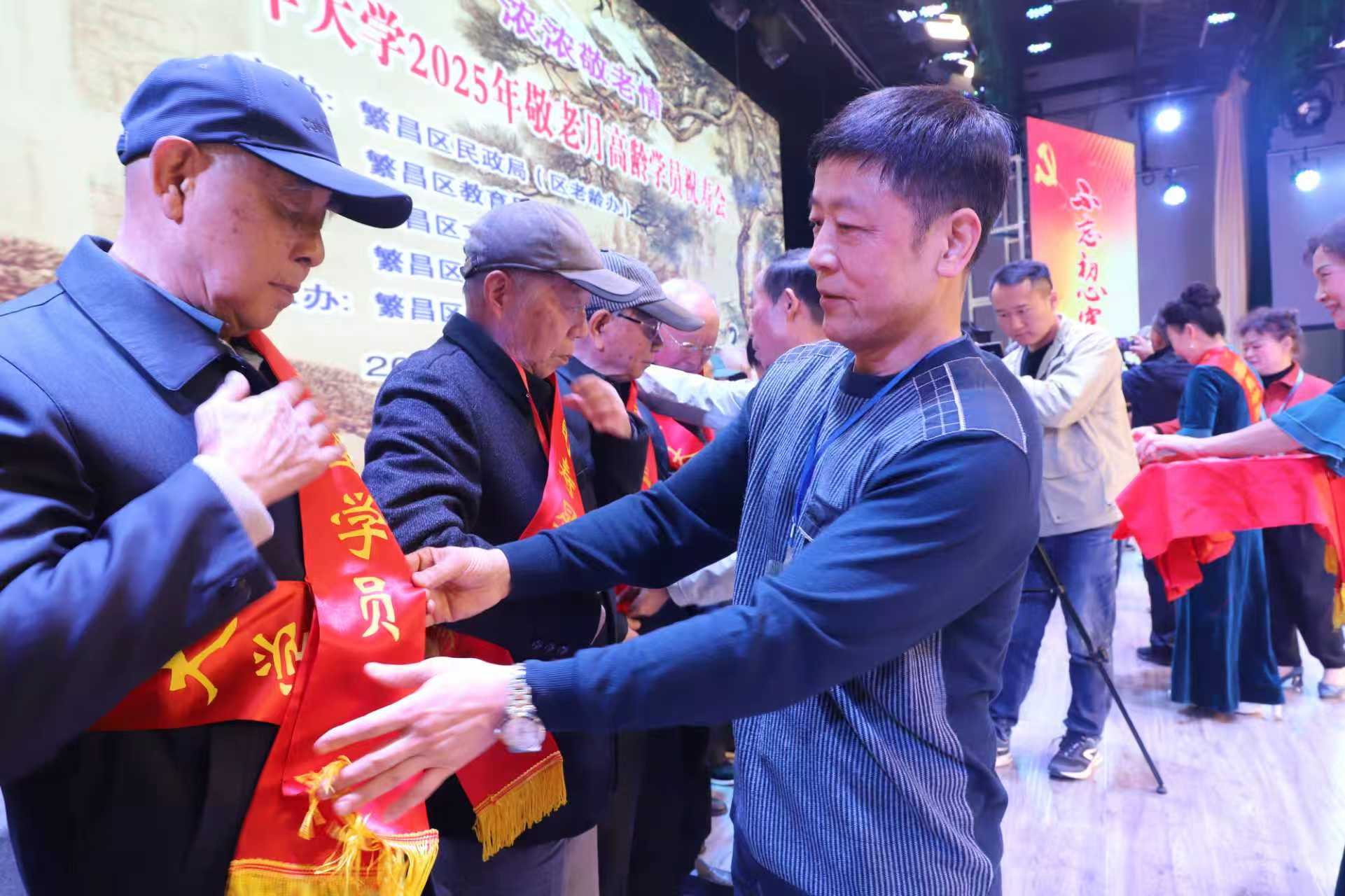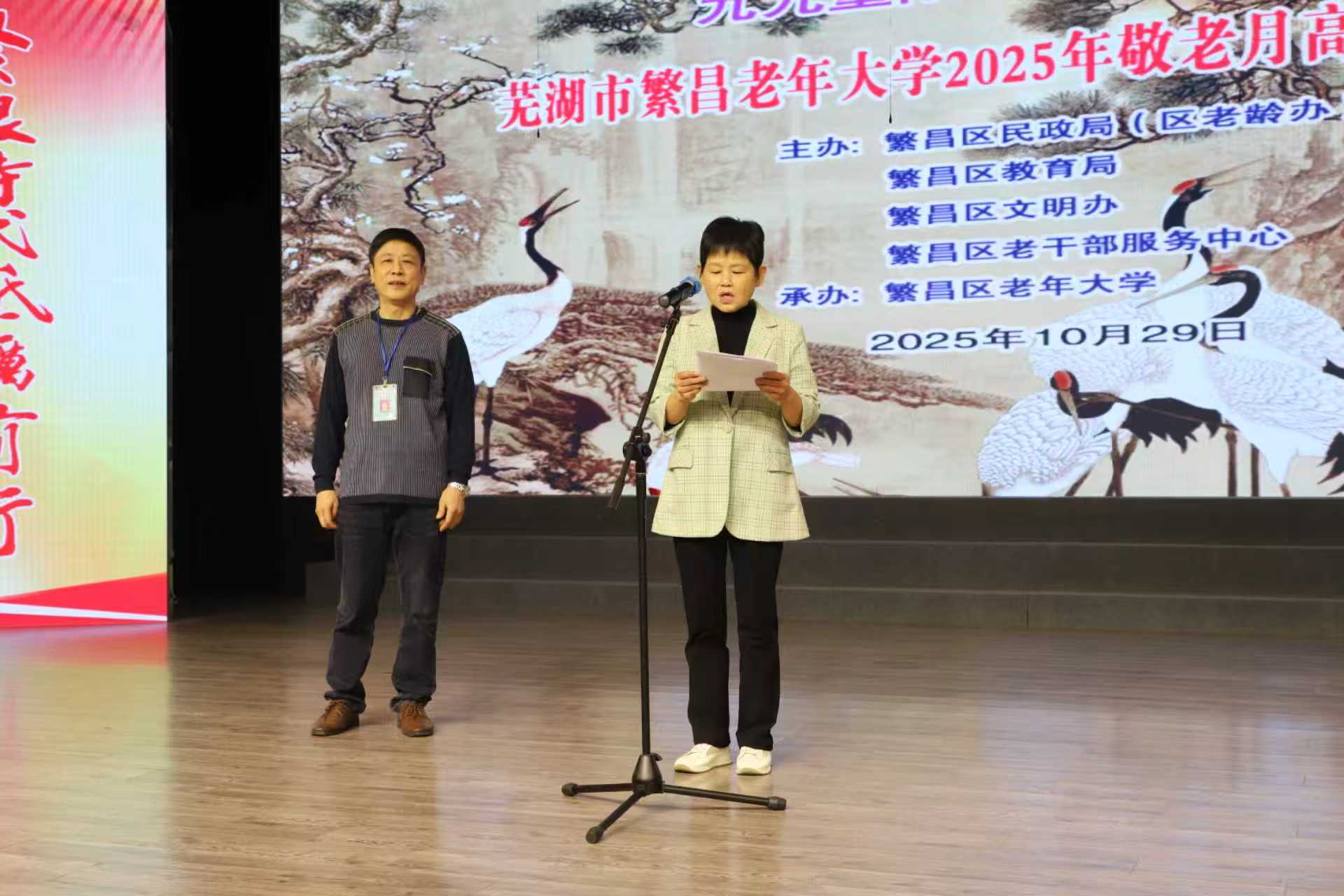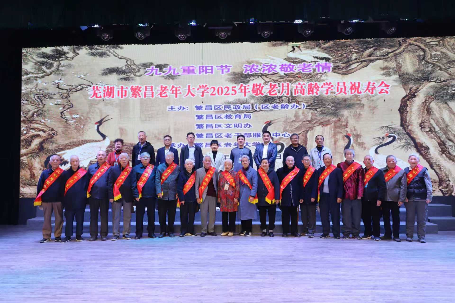 10月29日重阳节当天,由繁昌区民政局(老龄办)、区教育局、区文明办、区老干部服务中心主办,区老年大学承办的“2025年敬老月高龄学员祝寿会”在繁昌老年大学演出大厅隆重举行。祝寿会由繁昌老年大学党委书记、校长朱能雨主持。区政协副主席王重娟,区政协副主席、教育局党委书记、局长王心生,区民政局党委书记、局长何元明,区委宣传部副部长、文明办主任汪华锋,区老龄办主任刘天宇等出席祝寿会。区政协副主席王重娟作了热情洋溢的祝寿词。区领导和出席祝寿会的区有关部门负责人热情为90岁以上的寿星学员披挂寿带。