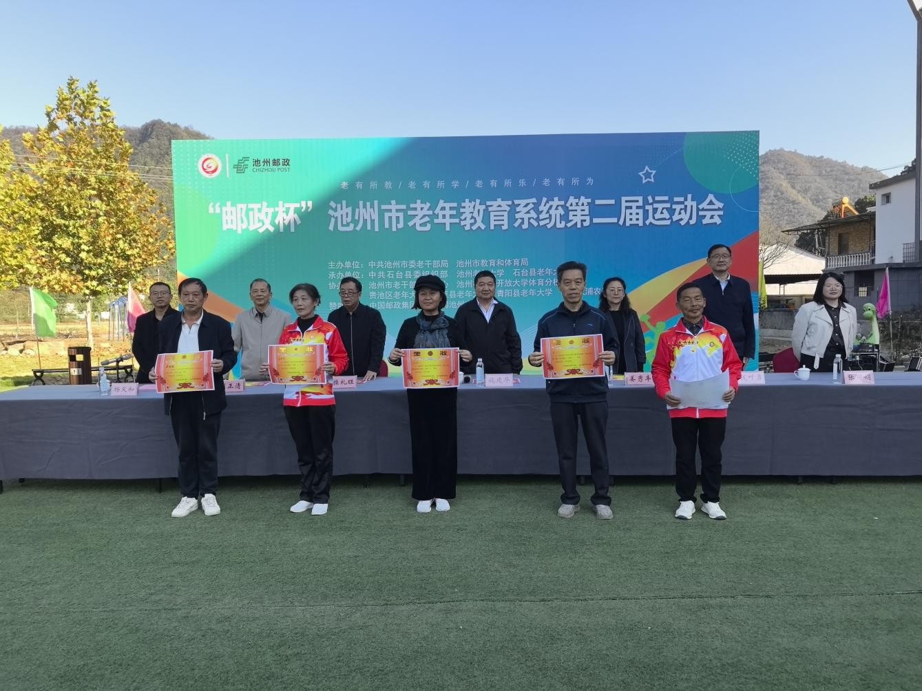 11月14日至15日,“邮政杯”池州市老年教育系统第二届运动会在石台县成功举行。市委常委、组织部部长李洪福宣布运动会开幕,市人大常委会原主任、池州老年大学名誉校长施建华致开幕词,石台县委书记、县长张勇致欢迎词,市委组织部副部长、老干部局局长姜秀丰主持开幕式,中国邮政集团公司池州市分公司党委书记、总经理王昌武致辞,市委教育和体育工委书记、市教育和体育局局长刘茂华,石台县委常委、组织部部长钱叶勇出席开幕式。市、县(区)老年大学、市老干部活动中心、市老年开放大学体育分校等8支代表队共赴银龄体育盛会。