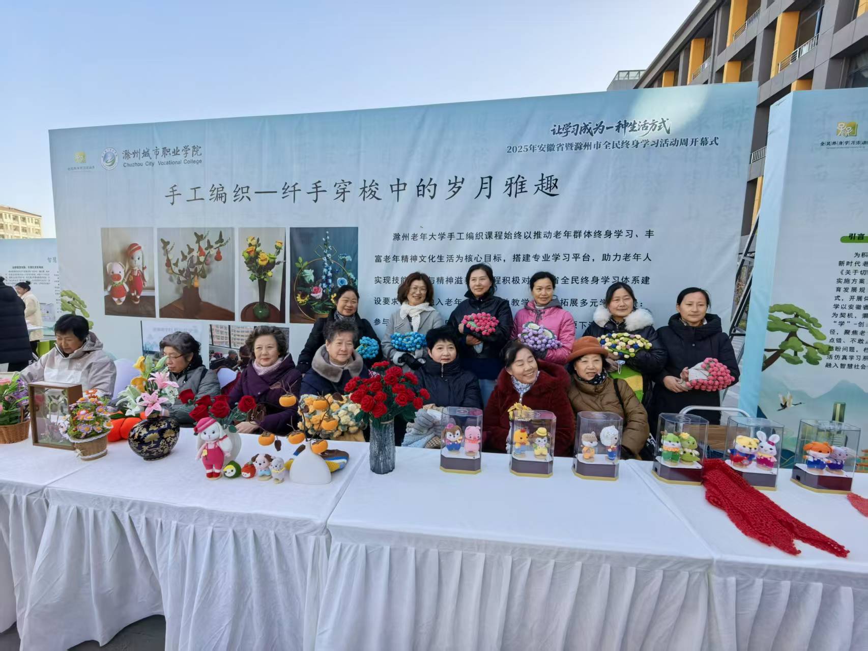 11月18日上午,2025年安徽省暨滁州市全民终身学习活动周开幕式在滁州城市职业学院隆重举办。滁州老年大学特色品牌课程——手工编织课精彩参展,现场陈列的百余件创意编织作品与“教学+服务+公益”的多元成果展示,生动诠释了老年教育与终身学习的深度融合,成为展会现场极具温度的亮眼名片。