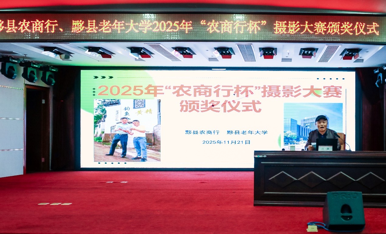 11月21日下午,一场汇聚着艺术与荣耀的盛会在黟县农商行三楼会议室隆重举行。黟县农商行与黟县老年大学联合举办的“2025年‘农商行杯’摄影大赛颁奖仪式”在此拉开帷幕,为这场以镜头捕捉美好瞬间的赛事画上了圆满句号。颁奖仪式由黟县老年大学副校长吴桂兰主持,黟县农商行副行长江燕、黟县老年大学校长严月全等领导嘉出席活动,共同见证这一荣耀时刻。