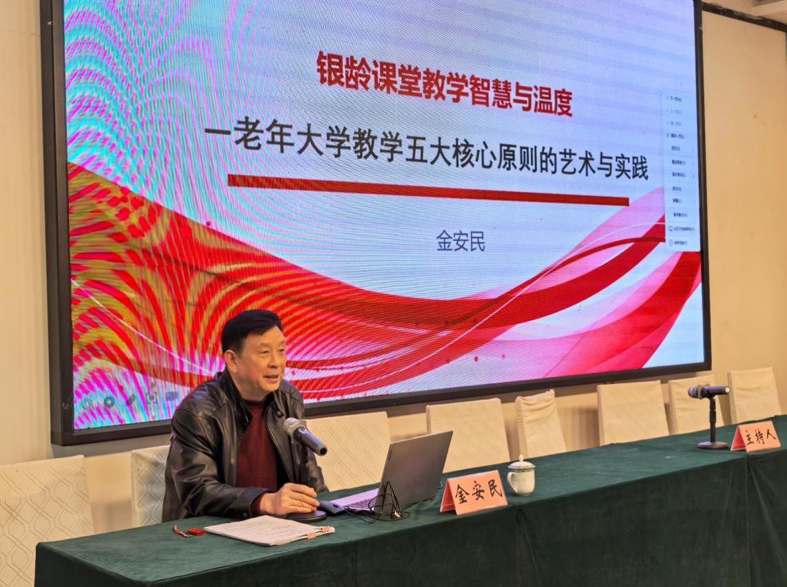 本次培训邀请了安庆市老年大学教务处主任、安庆老年教育领域资深专家金安民进行专题讲座。金安民身为全国外语园丁奖获得者、安徽省特级教师,安庆师范大学硕士生导师,拥有深厚的理论功底与丰富的实践经验。他的讲座内容详实、见解深刻,围绕老年教育教学规律、银龄课堂教学智慧与温度进行了深入浅出的讲解,为参训人员带来了前沿的理论指导和实用的工作方法,现场反响热烈,掌声不断。
