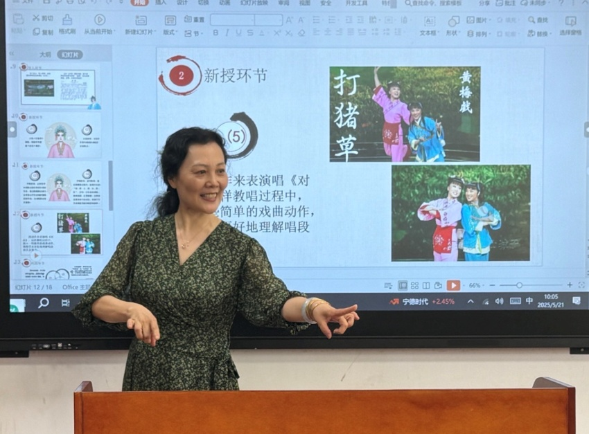 比如发声练习,她加入了绕口令,以此锻炼学员的记忆力和反应能力。针对黄梅戏学习,她敏锐抓住学员在道白、一字多音等方面的共性问题,进行专题突破,教学从慢到快循序渐进。