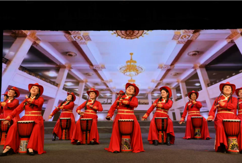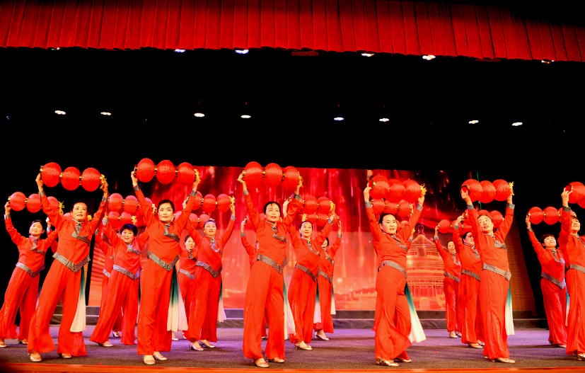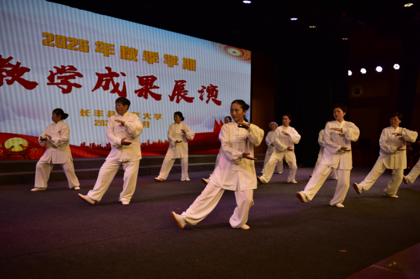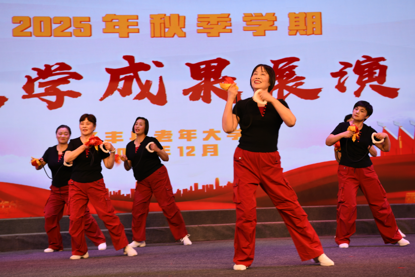 成果展在大合唱《走向复兴》中拉开序幕。舞蹈《祖国你好》,20位如仙女般装扮的舞者,以优美的舞姿展现祖国的壮丽河山,向高质量发展的伟大祖国致以最崇高的敬意,送上最深情的祝福!电吹管班的《最美的歌唱给妈妈》,以温暖的音色传递着对母爱的礼赞,使旋律充满倾诉感。拉丁舞班带来的《搀扶》,每段舞步背后,情感在悄然流淌,让人们感受到,你我相互搀扶不仅能传递心灵的旋律,更能共同谱写生命的乐章。朗诵班推出的配乐朗诵《秋天里的中国》,让人领略到大自然的画笔在中国大地上挥洒出一幅壮美的画卷。庐剧《荷包相配人团圆》,以优美的唱腔,展示了传统戏曲如同一颗璀璨的明珠镶嵌在江淮大地上。瑜伽表演《水韵江南》,将银龄舞者装饰得美体如画,那猫式伸展的弧度,恰似吻过山脊的曲线。富华社区教学点带来的非洲鼓《站在草原望北京》,将大地脉搏化作声浪翻涌,每一记重击都敲出最本真的韵律诗篇。此外,太极类、八段锦、气功的表演充满阳刚威仪;腰鼓声声,如同激昂的战歌;健身球、柔力球的碰撞,充满了力与美的结合;京剧、黄梅戏、打莲厢、花鼓灯轮番上阵,彰显了中国传统文化的魅力;形体舞、广场舞、交谊舞、旗袍秀的接续登台,尽显东方神韵;器乐合奏、二胡合奏、葫芦丝合奏,如天籁之音,沁人心脾。整场演出共30个节目相继登场,掌声、喝彩声接踵不断。