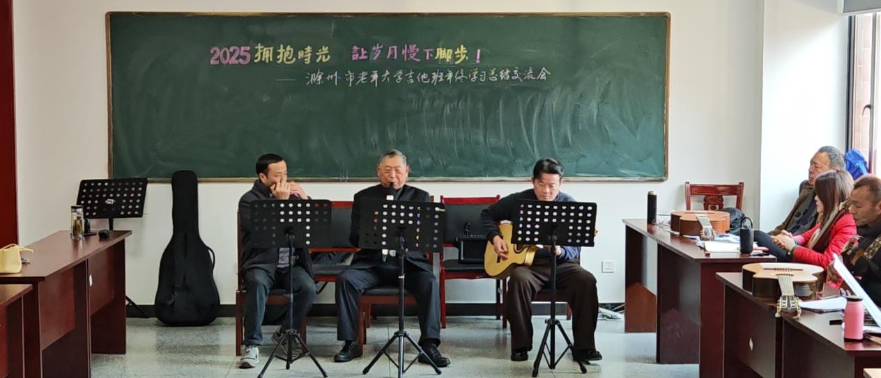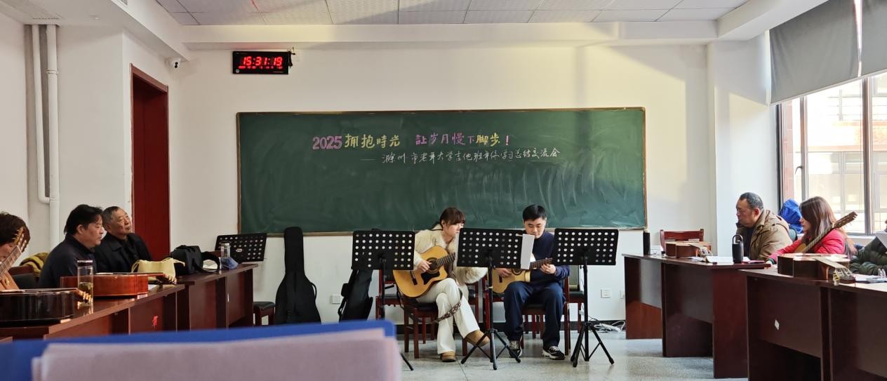 12月26日下午滁州老年大学420教室琴声悠扬、掌声阵阵,一场以“弦歌不辍 晚晴生辉”为主题的吉他班年度教学成果汇报联欢会在此温情上演。30余名平均年龄60岁的学员登台献艺,用指尖流淌的音符诠释着“活到老,学到老”的热情,为冬日校园增添了别样温暖。