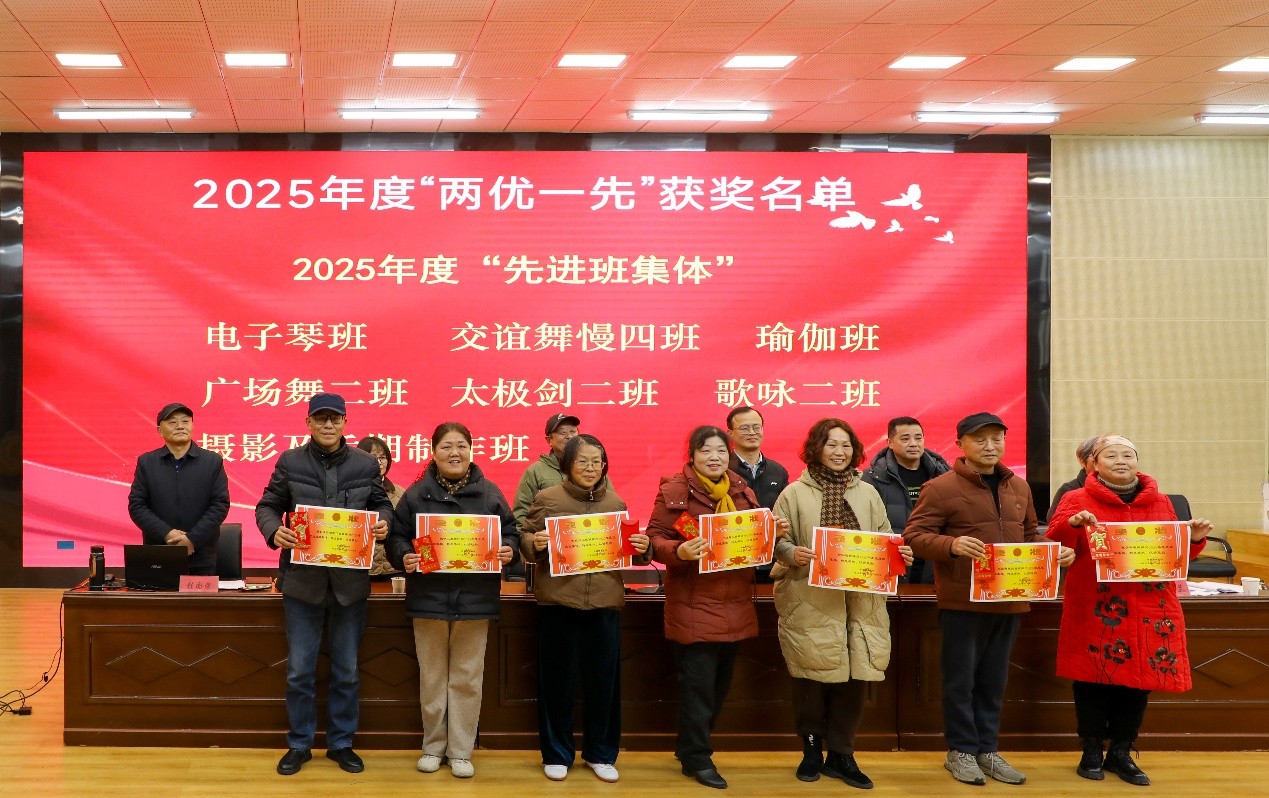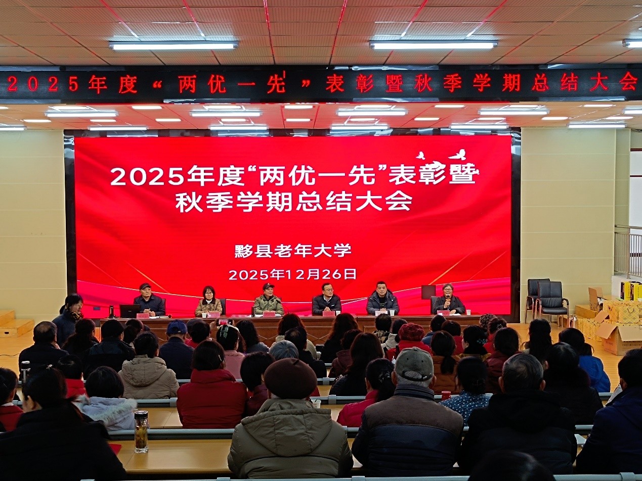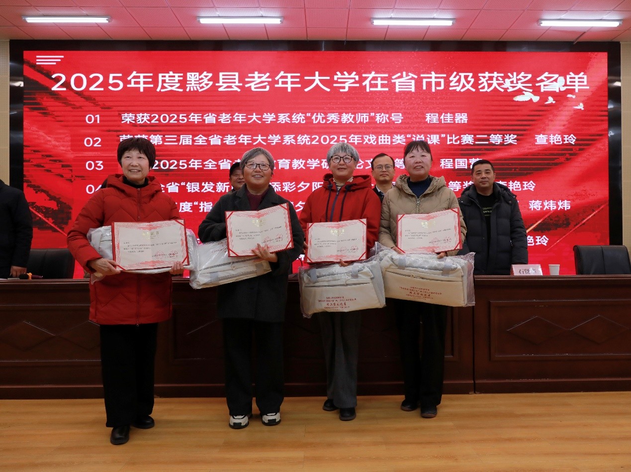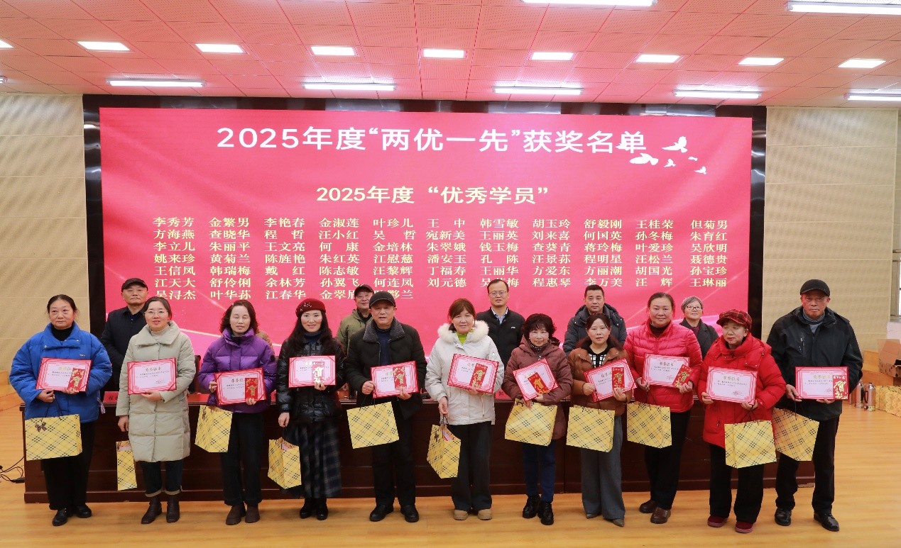 12月26日下午,黟县老年大学在黟县碧山小学阶梯教室隆重召开“2025年度‘两优一先’表彰大会暨秋季学期总结会”,旨在弘扬社会主义核心价值观,激发广大老年学员“老有所学、老有所乐、老有所为”的热情,彰显银龄风采,贡献银发力量。会议表彰了一批在2025年中表现突出的“先进班集体”“优秀班长”“优秀学员”。全面回顾总结了2025年秋季学期的丰硕成果,并对未来工作进行了展望。黟县老年大学校长严月全、县委组织部副部长邹辉、县教育局副局长余明慧等领导出席会议并为获奖者颁奖。学校全体教职工、各班党小组长、班长和荣获“优秀学员”表彰的学员百余人参加会议。会议由黟县老年大学与黟县邮政分公司联合举办,副校长吴桂兰主持。