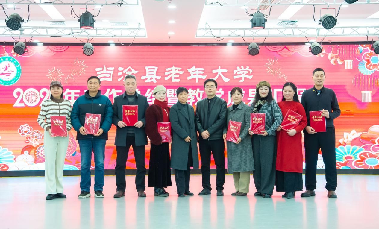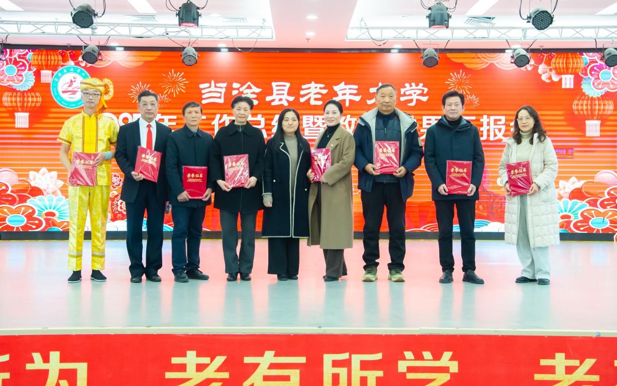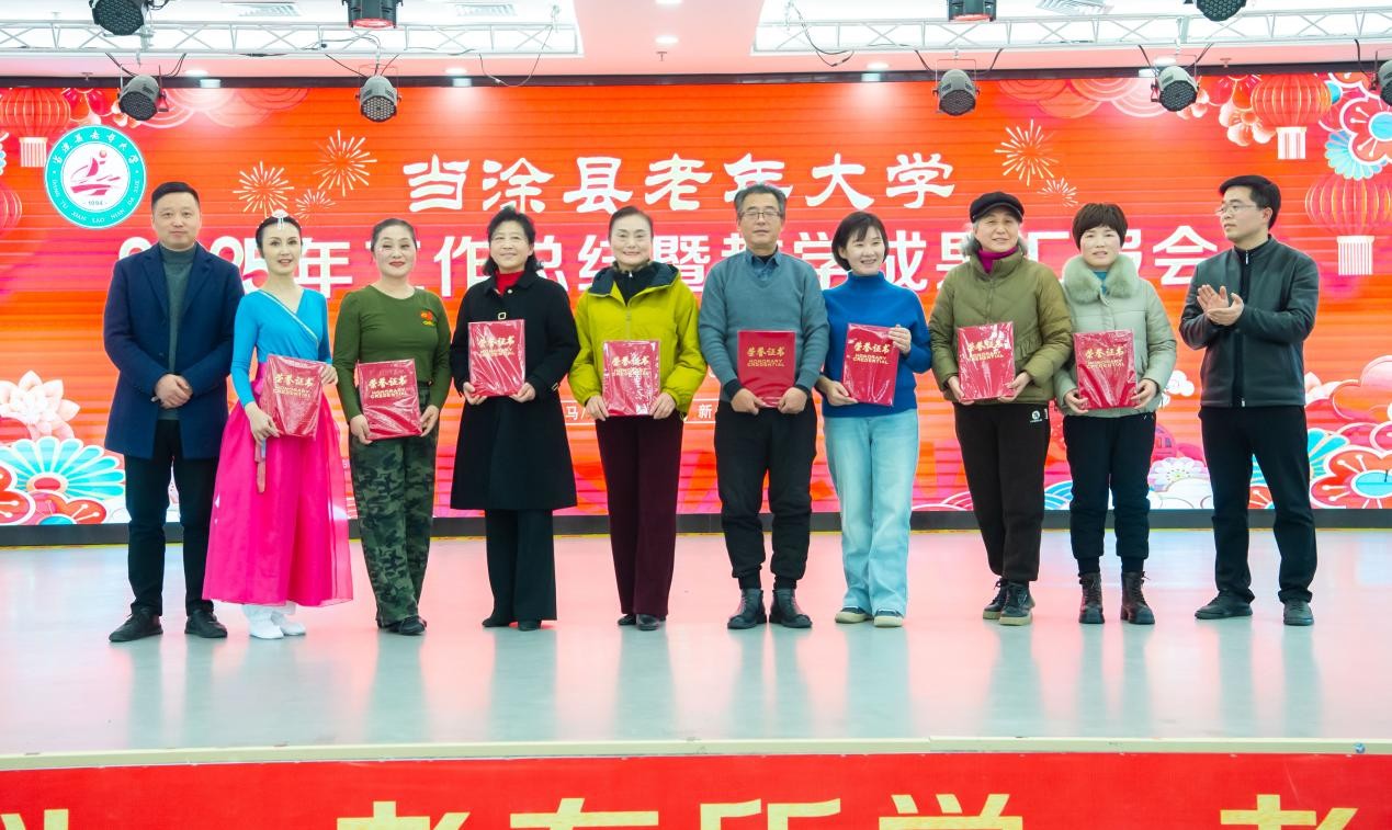 12 月 30 日下午,当涂县老年大学2025年总结表彰大会暨迎新年演出在五楼大厅圆满举行。中共当涂县委组织部副部长、老干局局长、县老年大学校长蒋培,县教育局副局长丁毳毳等领导与学校临时党委、校委会、学委会成员及受表彰的优秀党员、教师、班长、志愿者、学员、“网上学习之星” 等 400 余人齐聚一堂,共话收获、共迎新年,场面热烈而温馨。