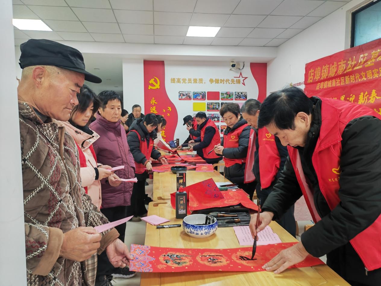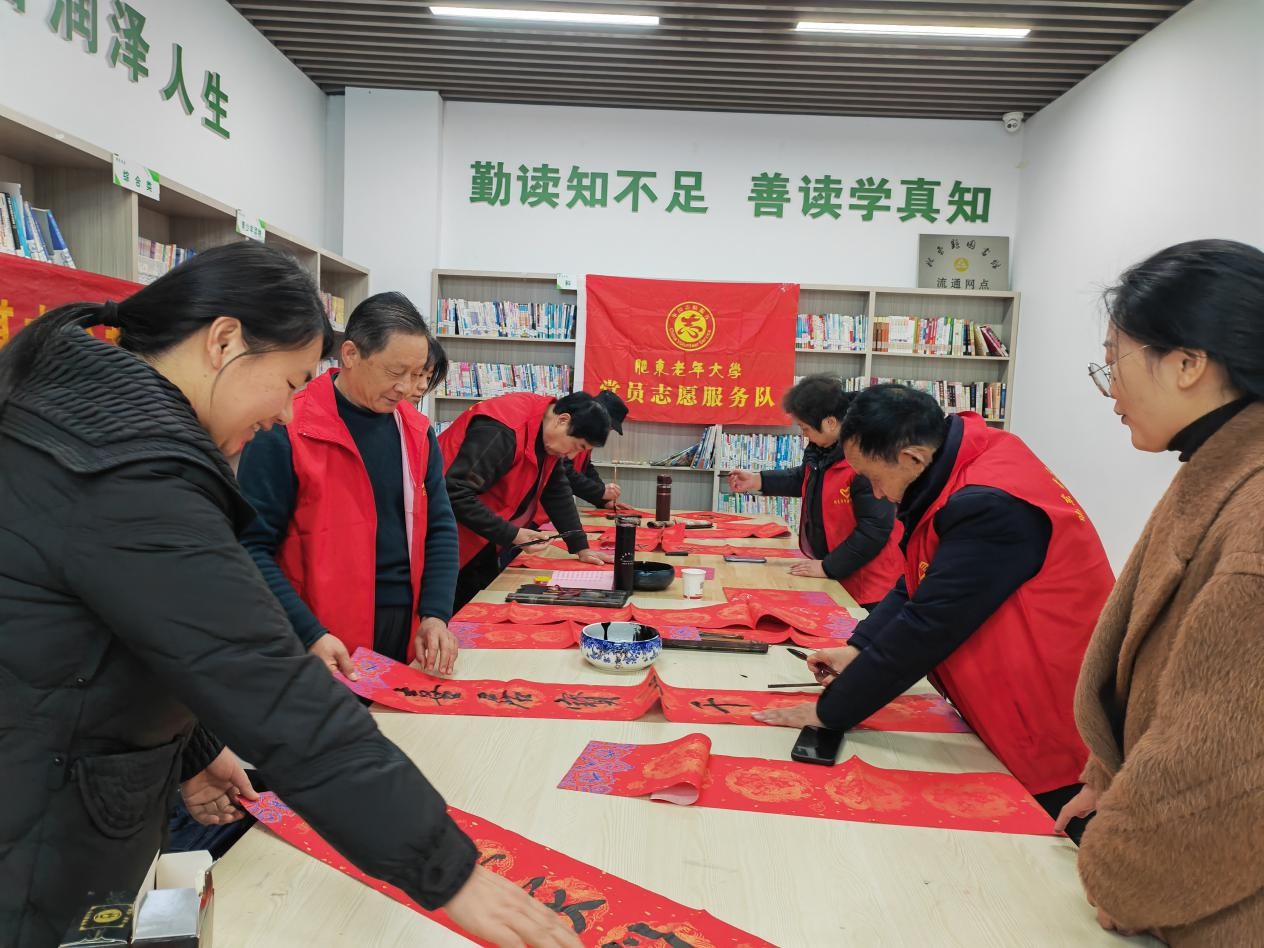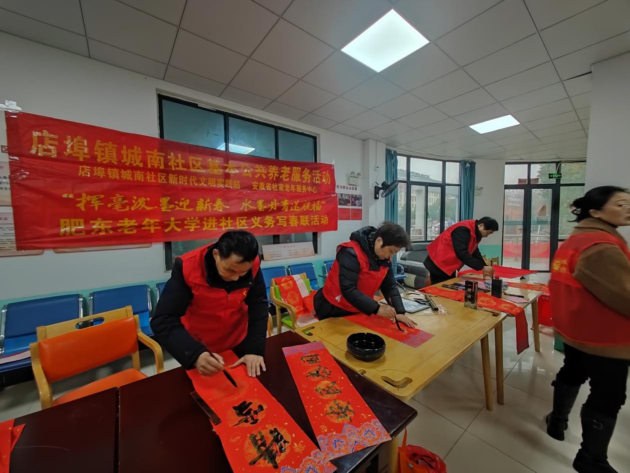 寒冬送祝福,春意暖人心。1月28日,肥东老年大学组织志愿者到店埠镇迎河家园和城南社区开展义务写春联活动,将新春的祝福提前送到居民家门口和心坎上。活动现场,翰墨飘香。志愿者们挥毫泼墨,笔走龙蛇,书写的春联或遒劲有力、或飘逸隽秀、或龙飞凤舞、或潇洒灵动。当天,志愿者们共为居民书写春联100余副、福字80多个。