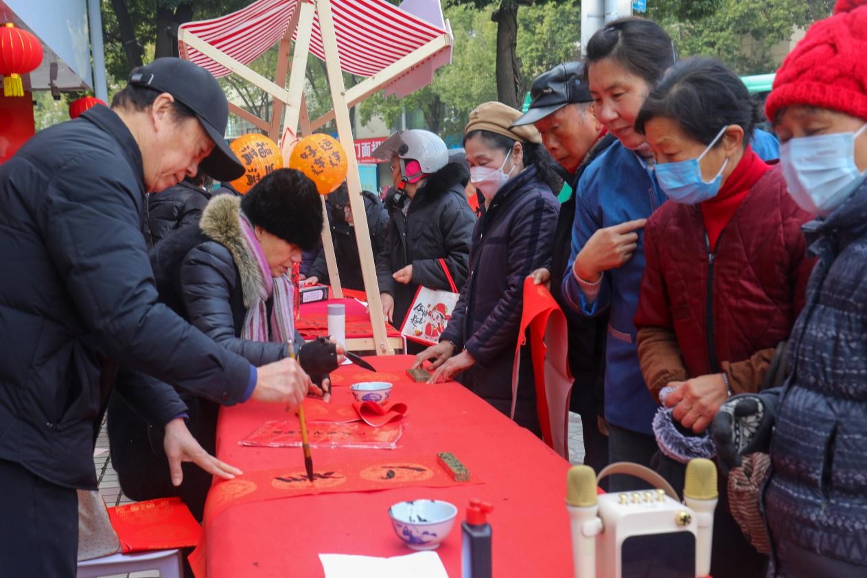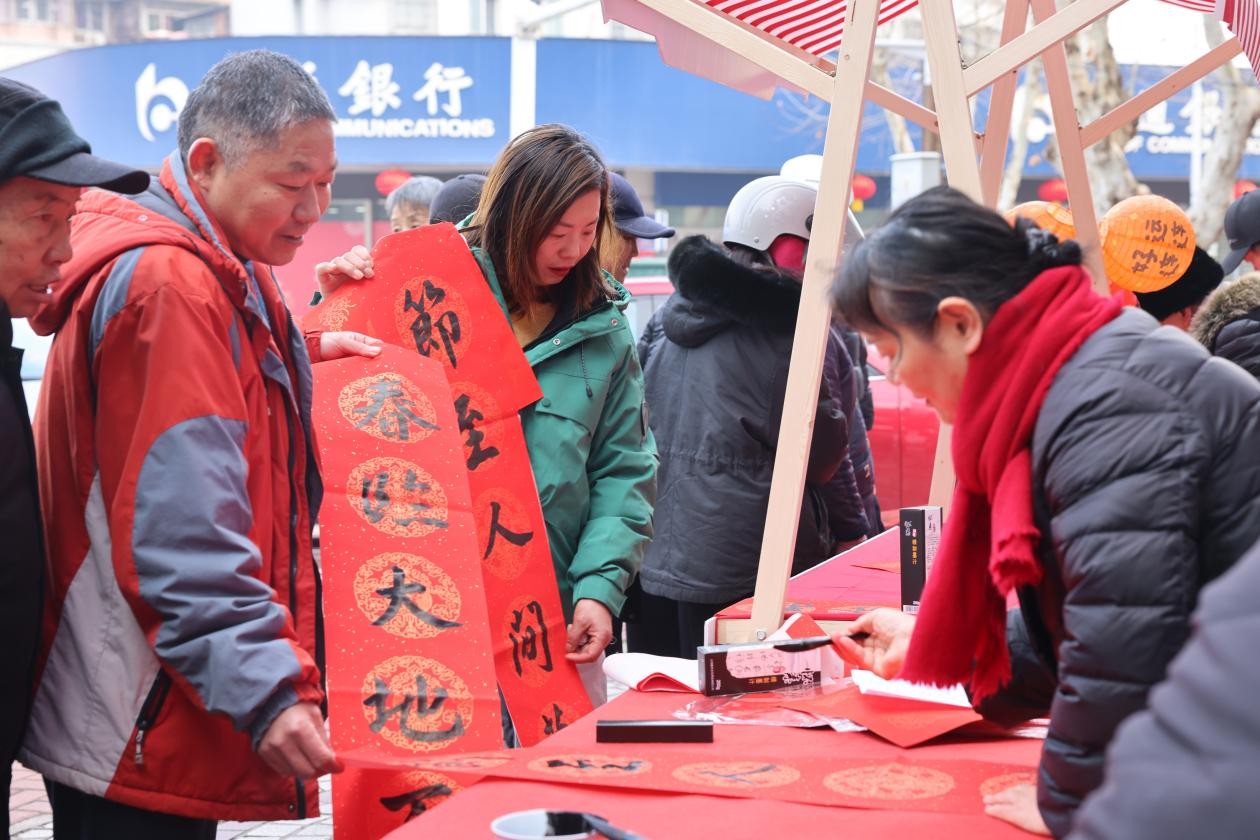 现场居民络绎不绝,大家驻足挑选心仪的春联与福字,银行工作人员与志愿者同步开展反诈宣传,将传统年味与安全知识相结合,让暖心服务更有温度。活动共送出八十副手写春联与福字,红纸黑字间,浓浓的年味儿与邻里情扑面而来。
