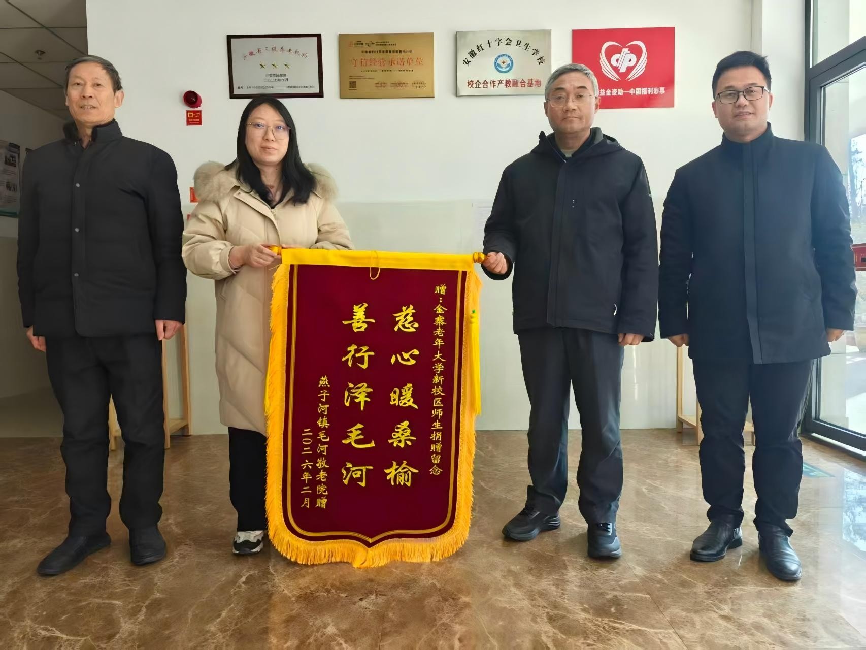 不仅是个别入户慰问,金寨老年大学师生还将爱心延伸到更远的地方。通过自发捐款,他们向燕子河镇柏杉康养中心和毛河敬老院捐赠了5500元善款,为那里的老人们送去新春的问候与支持。所有慰问资金均来自县老年大学师生们的自愿捐款,点滴汇聚成暖流。