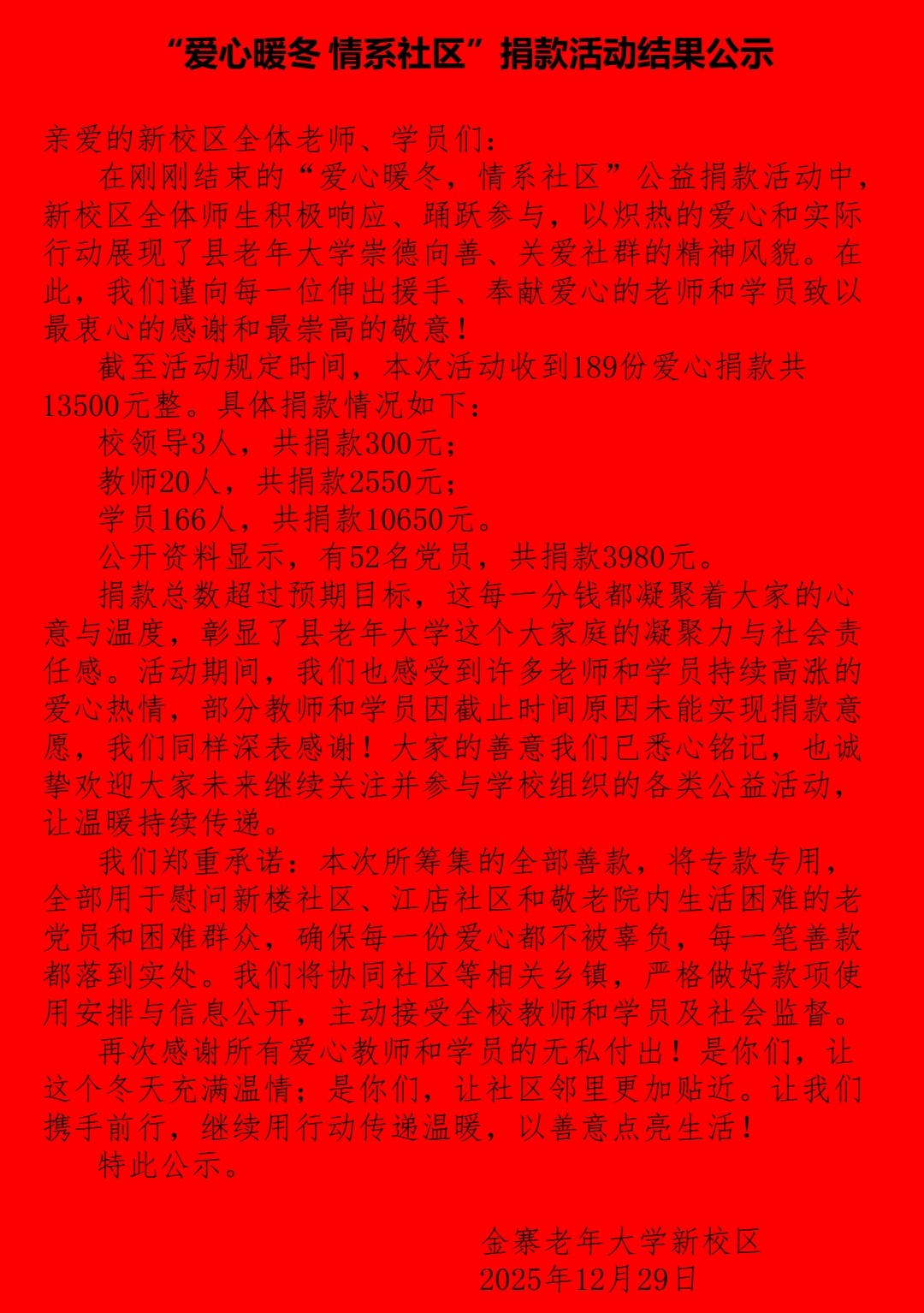 “我们虽然年纪大了,但能为社会再做点事,心里特别踏实。”一位捐款的学员这样说。倡议发出后,师生们积极响应,不分金额大小,每一笔捐款都承载着深深的关怀。目前,慰问物资已经全部送达新楼、江店两个社区的困难家庭。