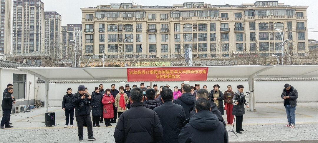 2月7日,太和县老年大学举行防雨停车棚交付使用仪式。县委组织部部务成员王道峰、县老年大学校长陆凤杰、肖口商会会长、安徽鲁能控股环保科技公司总经理邢秀亮、县市政公司经理单国峰、肖口镇政协联络组组长谷家祥等出席仪式。王道峰主持仪式并作总结讲话。