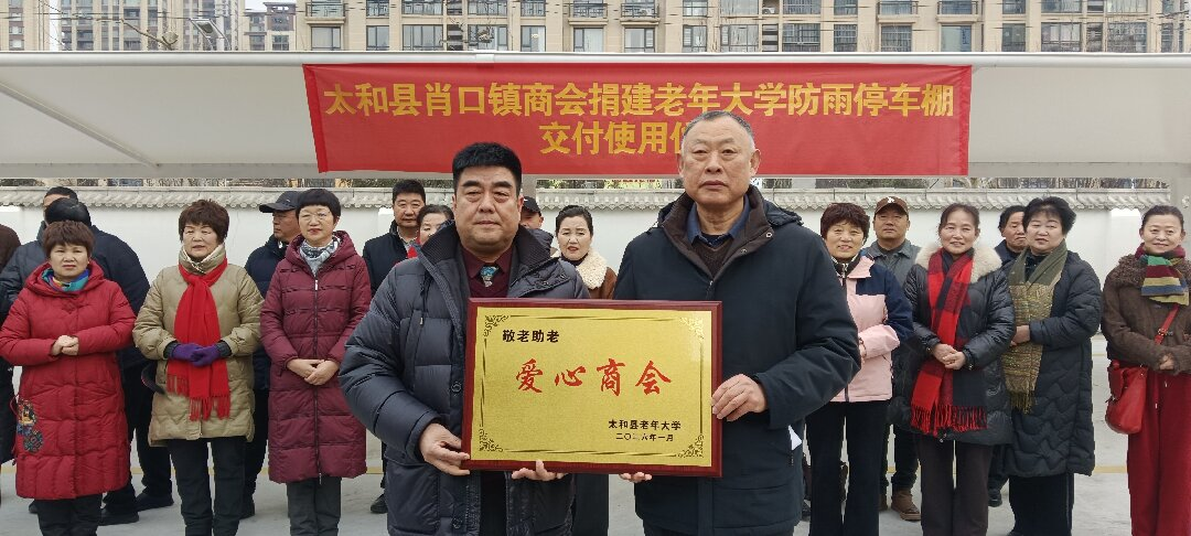 仪式上,陆凤杰在致辞中表示:太和县老年大学作为培育“三有”新时代老年人的重要阵地,近年来持续推进设施升级,此次肖口商会捐建的防雨停车棚,有效解决了老年学员停车避雨的实际需求,是商会践行社会责任、传递敬老温情的生动体现。