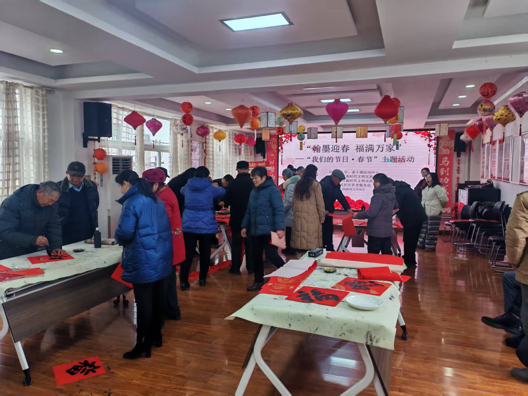 活动现场暖意融融、墨香四溢,气氛格外热烈。老年书法爱好者们齐聚一堂,他们饱蘸浓墨、挥毫泼墨,以娴熟的笔法书写出一幅幅寓意吉祥的春联和大红“福”字,将对新春的期盼、对生活的美好祝愿凝于笔端、融于翰墨,让社区居民在墨香中感受浓浓的年味。