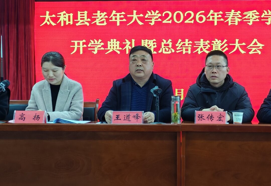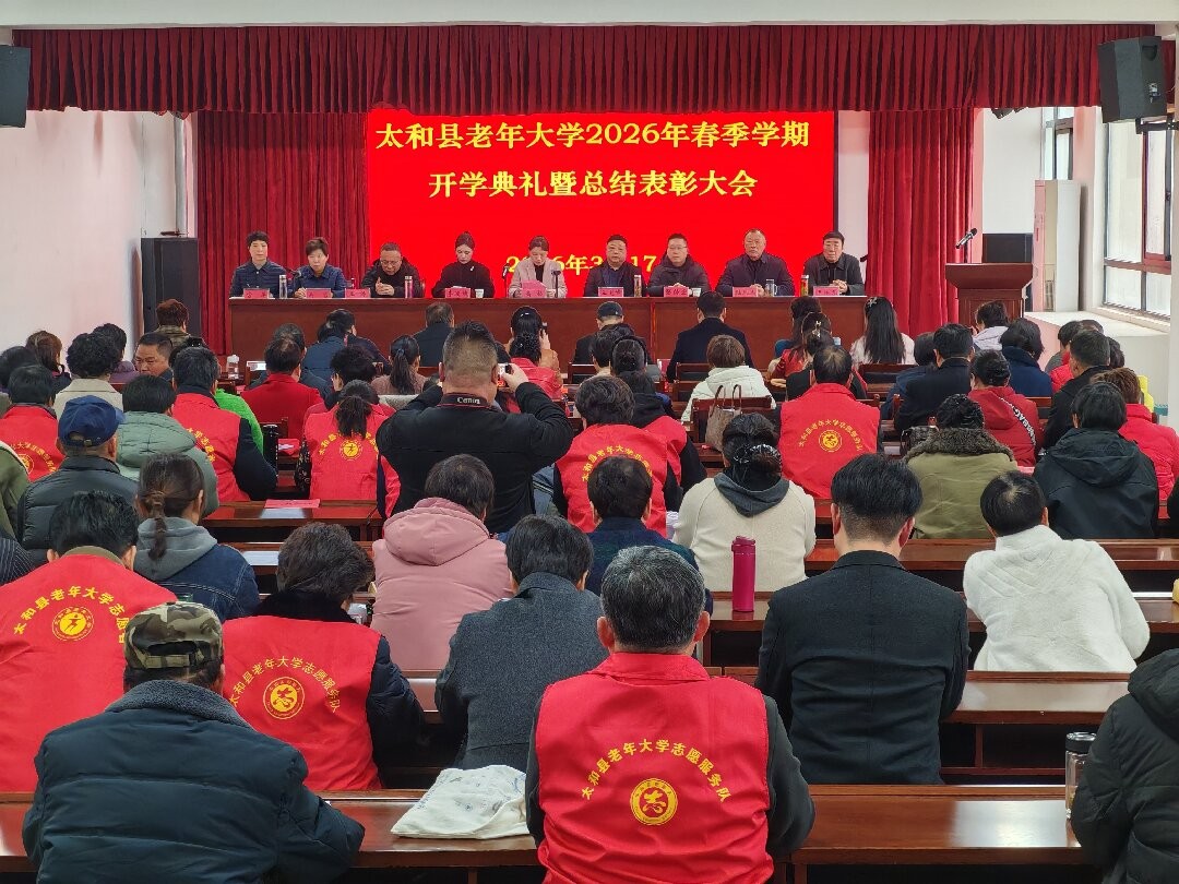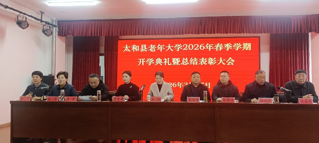3月17日,太和县老年大学召开2026年春季学期开学典礼暨2025年总结表彰大会。县政府副县长高扬、县委组织部部务会成员王道峰,县委宣传部副部长李迪婕、县委社会工作部副部长张传宏以及县直相关单位负责人、校领导班子、全体教师、班长及学员、志愿者代表参加会议。