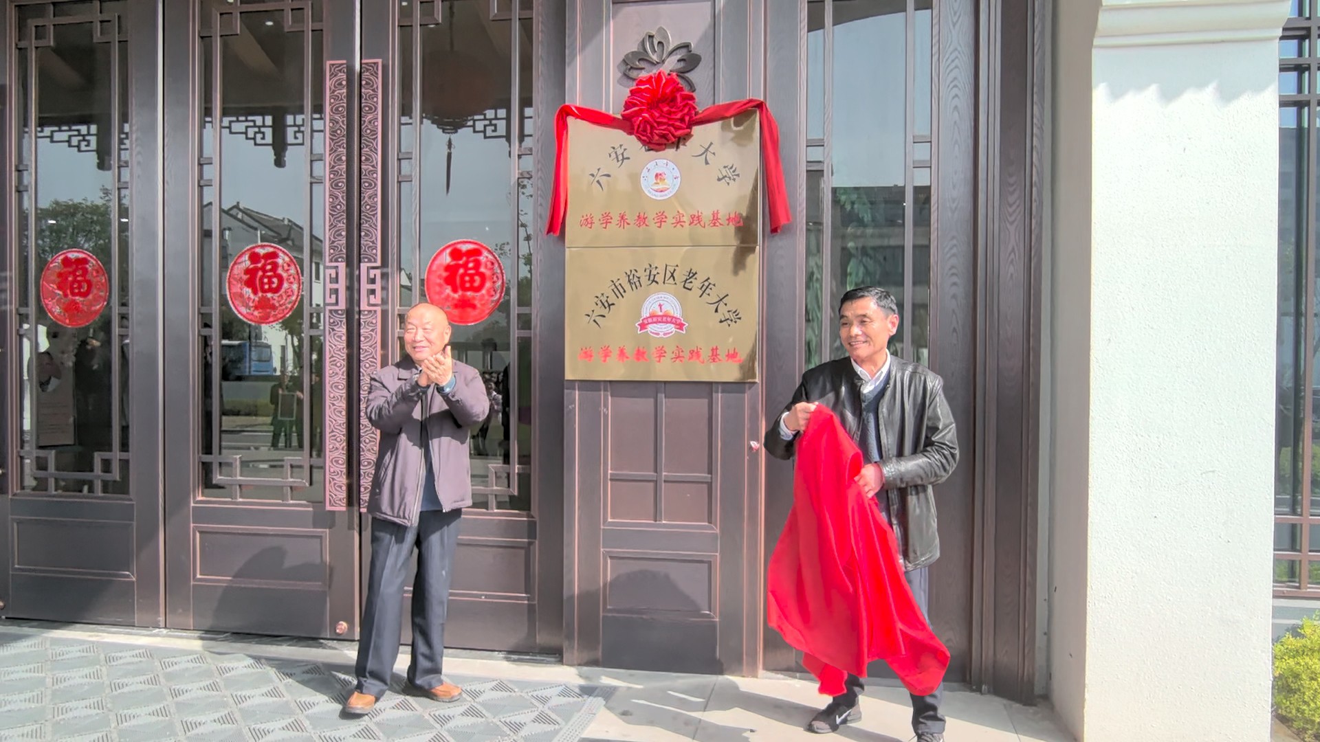 在热烈的掌声中,六安老年大学校长刘庆德与裕安区老年大学副校长叶庆和共同为“游学养教学实践基地”揭牌。