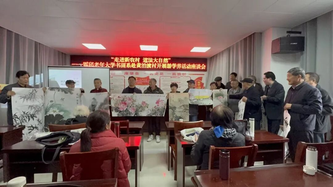活动后,召开现场研讨会:王曦书记介绍本村新农村建设成果;教师、学员、书画创作者代表陆续发言,畅谈游览感想、游学收获;马有彬副校长讲话:一是表示感谢,代表学校、参加活动人员,向黄泊渡村领导热情接待、精心安排表示衷心感谢;二是畅谈感受,对该村和美乡村建设概括为“六好”,即生态环境好、景点开发好、群众生活好、村支部工作好、党的方针政策落实得好、全村干群精神状态好,不愧为安徽省和美乡村精品示范村,不愧为霍邱县对外开放的一张靓丽名片,也不愧为霍邱老年大学选定的游学养教学基地。三是表达感想,肯定此次活动取得圆满成功,不仅是一次简单的参观游览,也是一堂学习先进的思政课,还是一堂别开生面的专业课,更是一堂不忘人民、回报社会的感恩课。