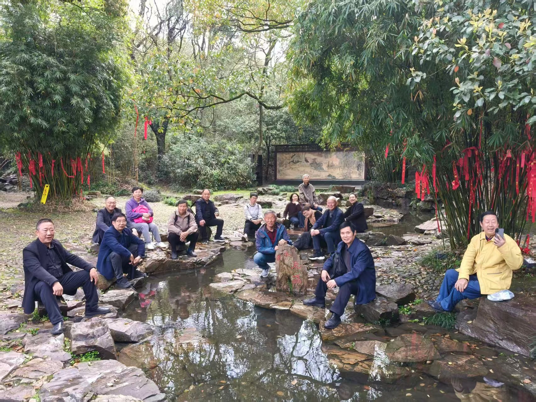 绍兴之旅的主要目的地是影响中国千年书法的兰亭圣地,是学员们的圆梦之地。一踏进这方圣土,就见圣人酒过三巡,醉醺醺地靠着石壁躺着,袒胸露肚,双眼曚昽,左手指着同行者,仿佛在说,该你饮酒作诗了。一行人有仰头吟诗的,有俯首抚琴的,有托须沉思的,有酒杯在唇齿边暂停住的……个个栩栩如生,惟妙惟肖。走进“文人天趣清犹水,贤者风期静若兰”的校门,只见此地有崇山峻岭,茂林修竹,曲水迂回,顿觉此地乃幽静之处。走近鹅池,鹅池碑(相传王羲之、王献之父子合书)映入眼帘。几只大白鹅或引吭高歌,或脖子一伸一缩,或埋头打盹。据导游介绍,王羲之的众多“之”字绝不雷同是受鹅脖的启发,看看也像是。来到流觞亭,此时,“天朗气清,惠风和畅,又有流觞曲水,清流激湍,映带左右。”真是应景。大家列坐在石块上,树叶飘过时,学员情不自禁吟诵起《兰亭序》,老顽童们体悟曲水流觞雅韵,沉浸式感受魏晋名士的风雅。进入亭内,大家细细欣赏42贤士饮酒作诗图长卷。蒋竺江老师一边鉴赏瑰宝,一边或答疑解惑,或滔滔不绝讲解名人趣事,或引经据典,讲解书画艺术的来龙去脉、前世今生。