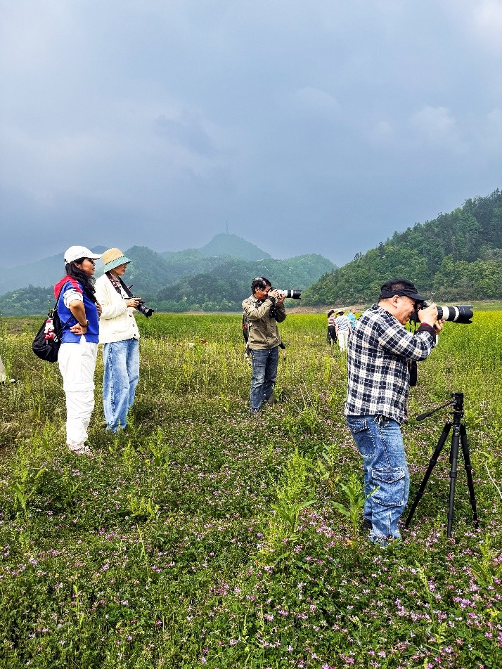 随后,学员们分散开来,各自寻找心仪的拍摄点。有的学员选择站在高处,以俯瞰的视角拍摄花海与湖面的全景,展现出大自然的广阔与壮丽;有的则蹲在花丛中,专注于拍摄紫云英的特写,将花瓣的纹理和露珠的晶莹都清晰地记录下来;还有的学员以湖面为背景,捕捉花海中随风飘动的花枝,为画面增添了一份灵动与诗意。