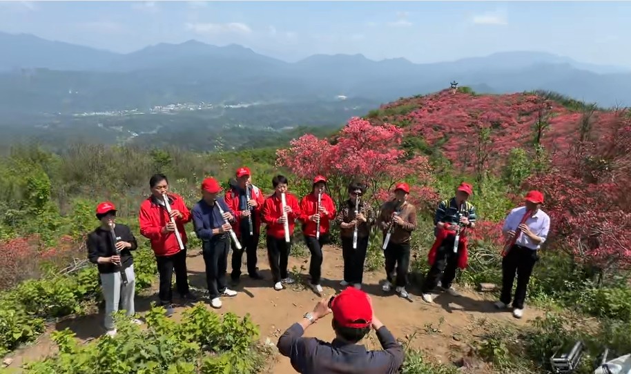 随后,学员们登上吴家店镇太平山。春日的太平山,万亩野生映山红竞相绽放,与层峦叠嶂的青山交相辉映,勾勒出一幅壮丽的春日画卷。站在高山之巅,俯瞰连绵起伏的大别山,学员们被眼前的美景深深打动,更被这片红色热土孕育的革命情怀所感染。大家自发围成一圈,以悠扬的管乐奏响经典红歌《十送红军》。清越绵长的旋律在山间回荡,与漫山的映山红相映成趣,仿佛穿越时空,诉说着军民鱼水情深的动人故事。乐声时而深情婉转,时而激昂嘹亮,引得在场的学员与游客纷纷驻足聆听,掌声与欢呼声在山谷间久久回荡。