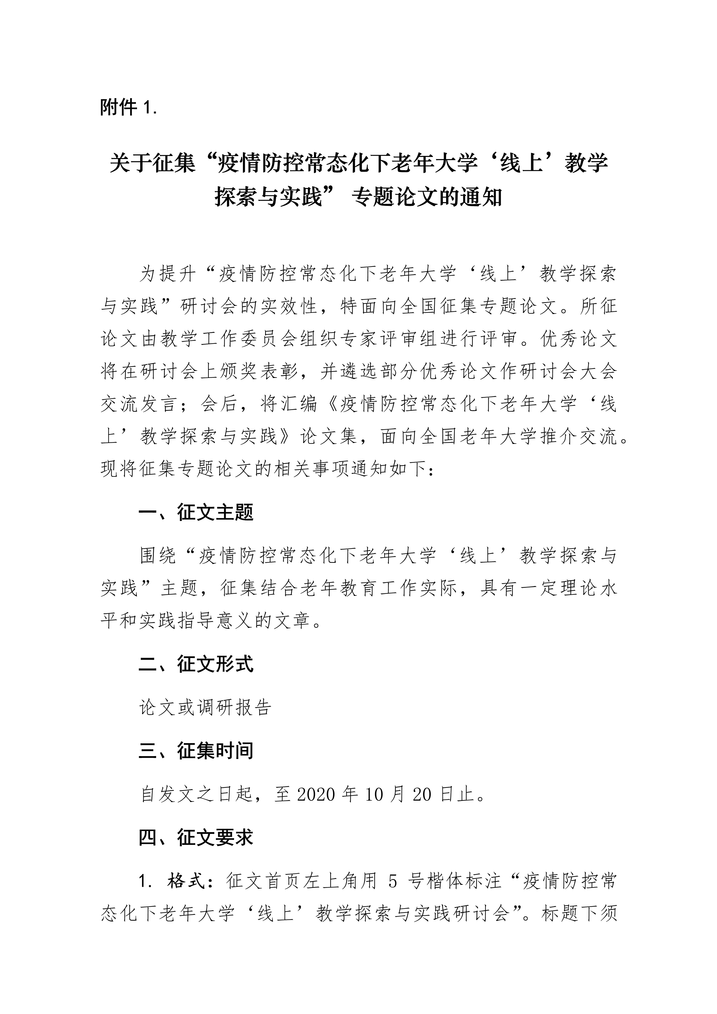 中国老年大学协会教学工作委员会下发了《教学工作委员会、远程教育工作委员会关于联合召开“疫情防控常态化下老年大学‘线上’教学探索与实践”研讨会的预通知》 ,同时征集有关主题论文,现将文件转发给你们,请积极组织参与,按照文件要求报送相关材料。