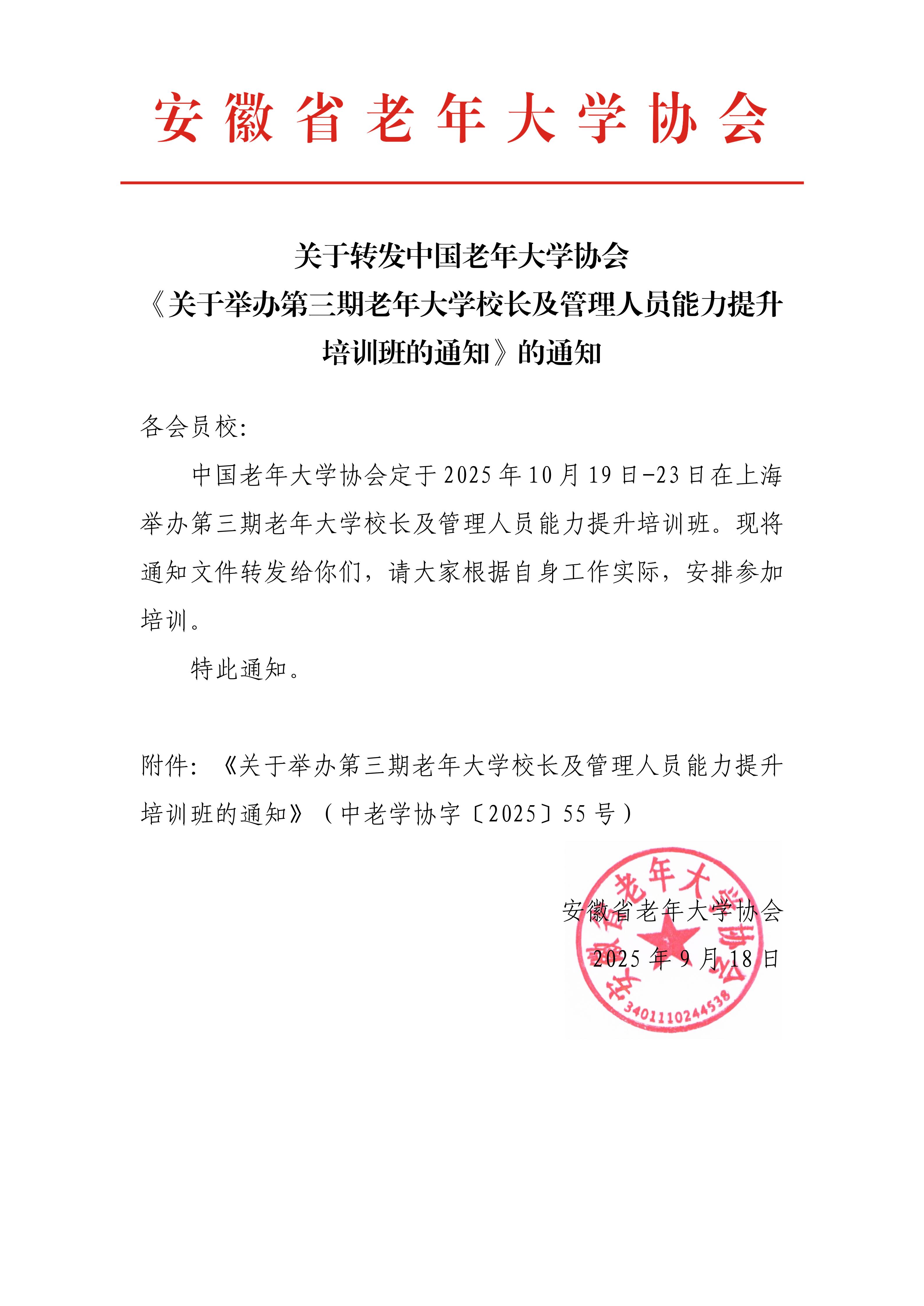 关于转发中国老年大学协会《关于举办第三期老年大学校长及管理人员能力提升培训班的通知》的通知