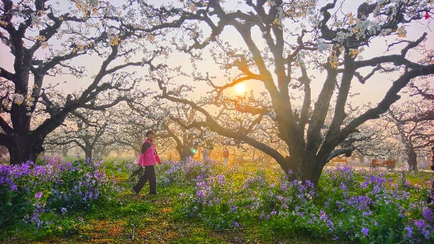 第二天转战砀山梨树王景区,百万亩梨花竞相绽放,如云似雪,古老的梨树枝干虬劲,蔚为壮观。大家几进梨园,从晨曦初露拍到夕阳西下,用镜头追逐光影变幻中的花海胜景。大家既是拍摄者,也成了彼此镜头中的风景。正如学友张中海诗中所咏:“丹青纵有生花笔,难写梨园百日春。”此行学习氛围尤为浓厚:白天拍摄途中,学员们随时交流心得,沈磊老师现场指导构图用光,大家现学现拍;晚上则利用休息时间聚在一起,李军民同学毫无保留地将Ai后期制作技巧手把手传授给学友,教大家将照片制作成动感视频,互帮互助的温情成为旅途中一道别样风景。