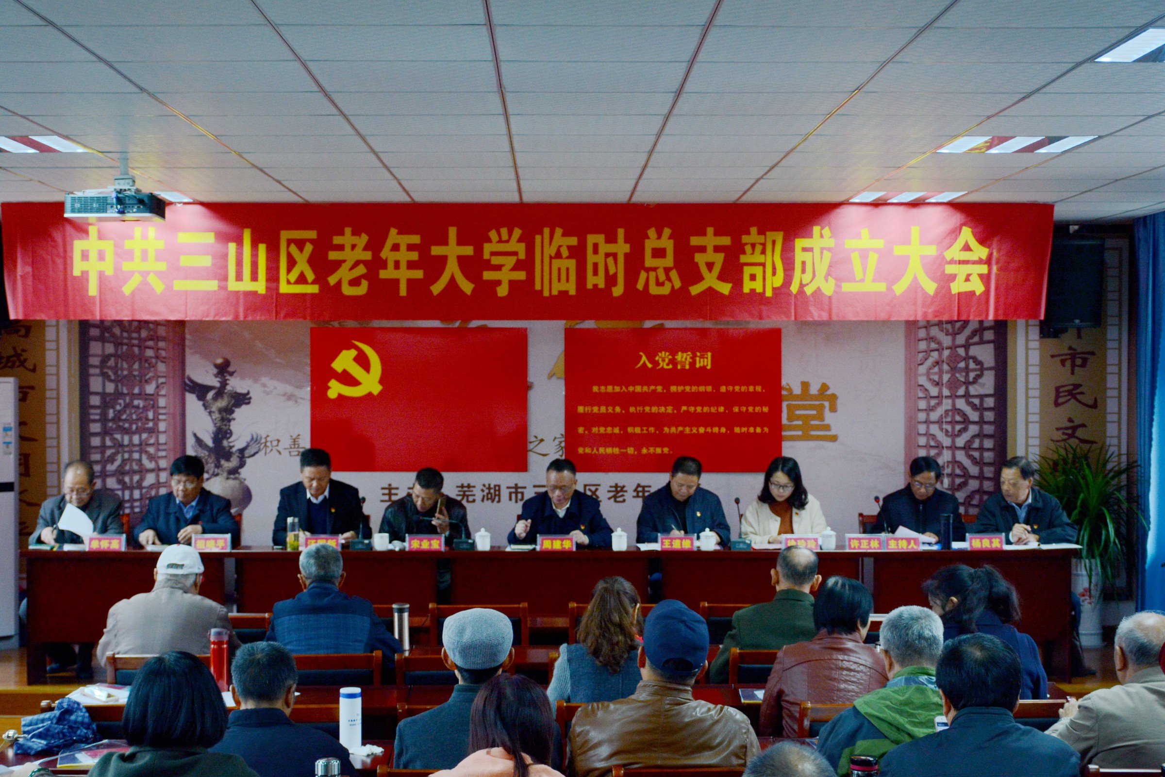 11月8日,芜湖市三山区老年大学召开临时党总支成立大会,区老教委副主任、区老年大学校长周建华到会讲话,区老教委办公室主任宋业宝、龙湖街道党工委书记王道维、龙湖街道党工委副书记徐玲玲等领导出席会议,区老年大学临时党总支委员和50多名党员参加会议。会议由临时党总支副书记许正林主持。