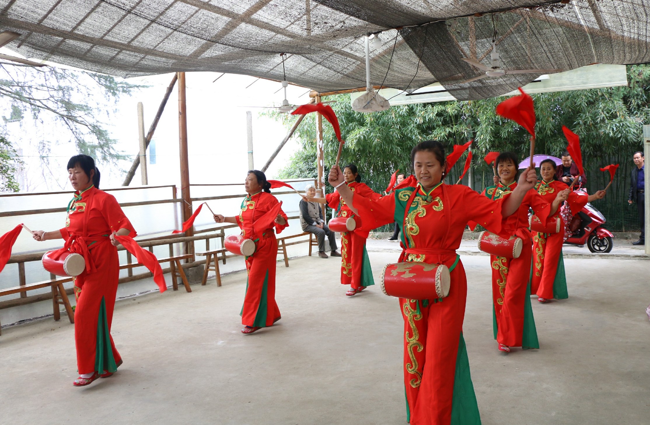 唐宗清为了学习舞蹈,学会了电脑,学会了上网,唐莲芝、唐雪芬等她们都是队伍中的积极分子,每场表演都是和大家一起精心准备,精心打扮,给村民展示最美的风采。队伍中年龄稍微年轻一点的倪明翠,搬运大鼓车上车下的总是抢在前,她还主动义务买来化妆品,为队员精心妆扮,让每一名队员展示最美的形象。