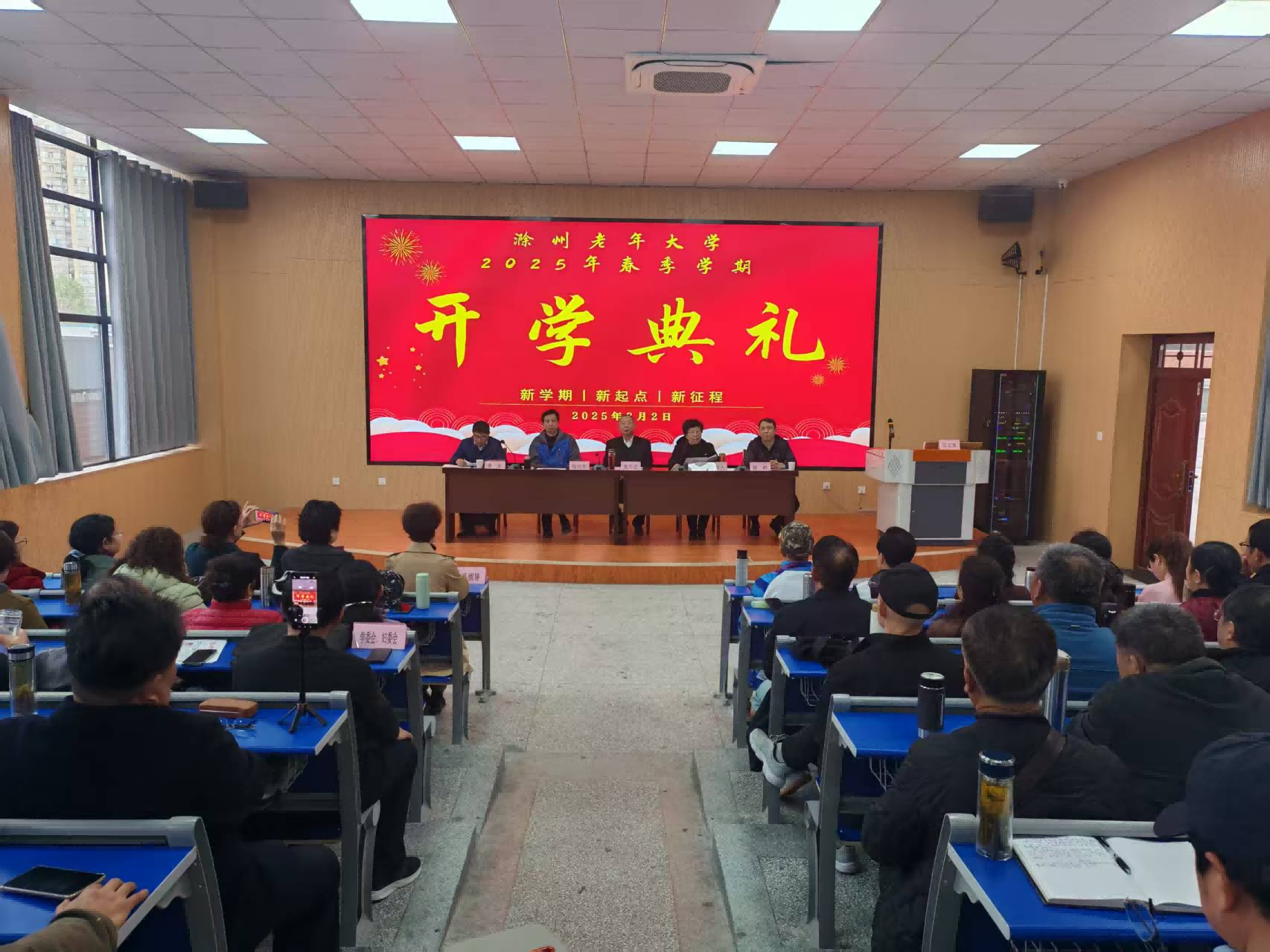 3月2日下午,滁州老年大学举办2025年春季开学典礼。滁州市委组织部副部长、老干局局长陈岭,校领导张尽忠、施芝华、张信军、余宝出席典礼,各系、学委会、妇委会、分校、校外学院代表,以及教师和学员代表约120人参加。