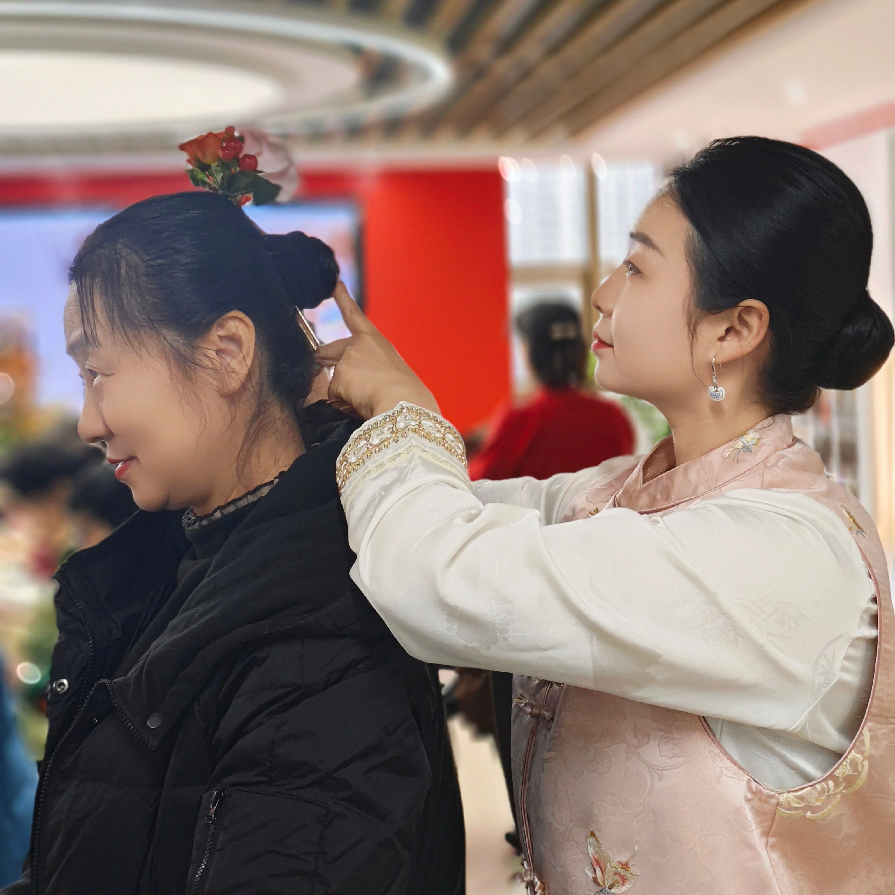 “你看我这簪花,像不像古装剧里的贵妃?”“哎呀,你这气质,简直是‘甄嬛本嬛’!”大家你一言我一语,互相打趣,仿佛回到了少女时代。室内的微暖的灯光映照在她们的笑脸上,连空气都变得甜滋滋的。