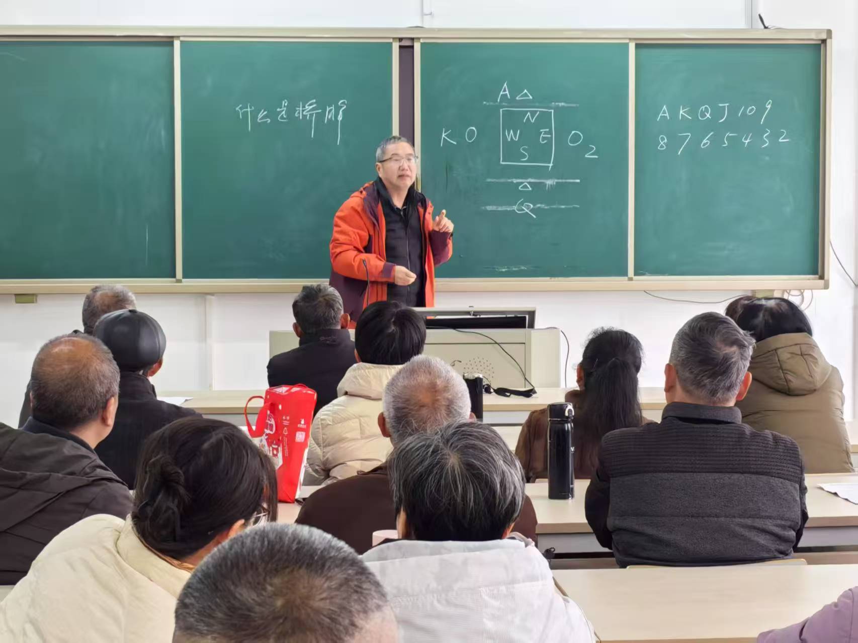 方宁为在座学员们带来开班“第一课”。他以通俗易懂的语言讲解了桥牌的基本规则及逻辑思维要点,并结合实战案例演示叫牌、出牌策略。学员们聚精会神聆听,不时记录要点。