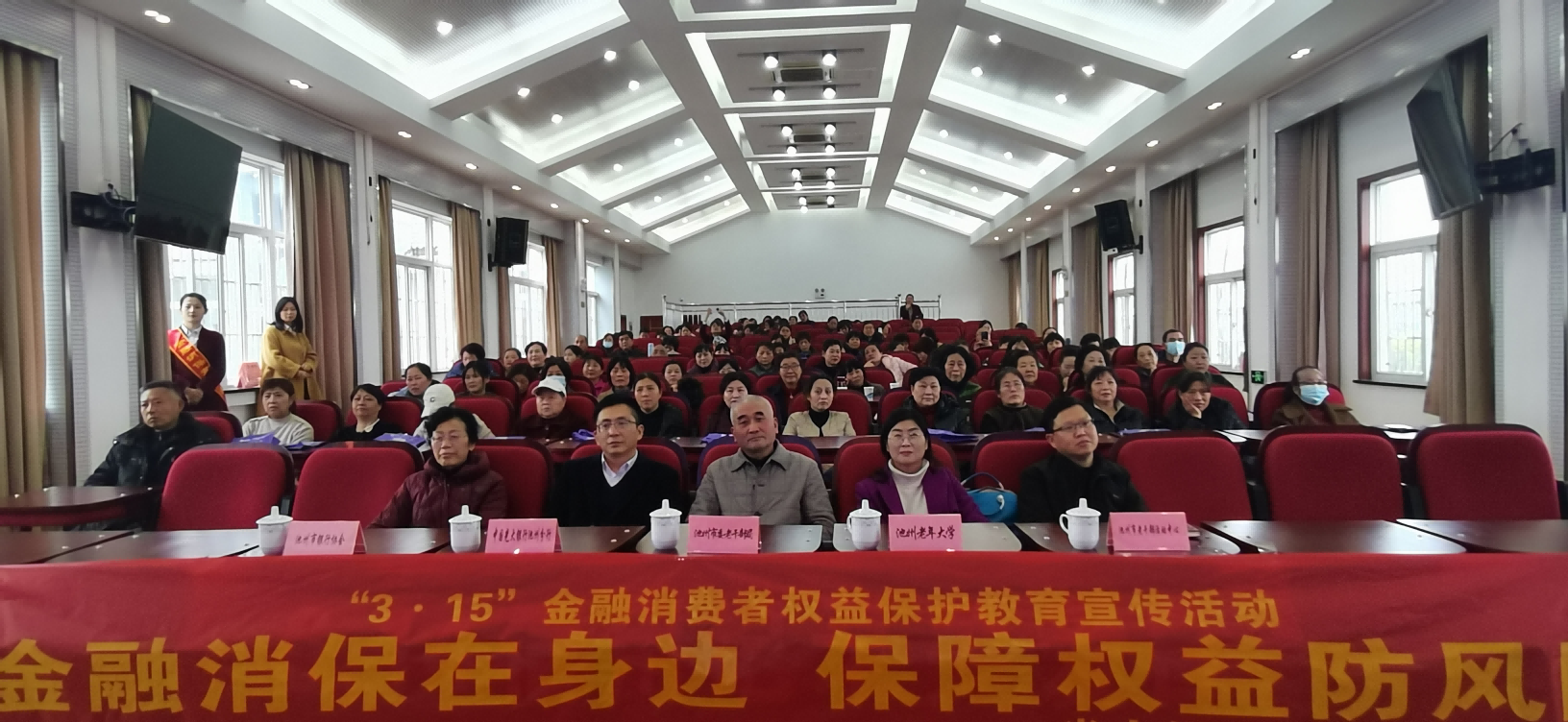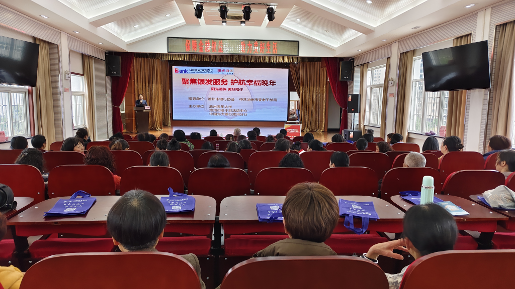 3月11日下午,在池州老年大学南校区五楼多功能厅,由池州市银行协会、中共池州市委老干部局指导,池州老年大学、池州市老干部活动中心,中国光大银行池州分行主办的防范养老诈骗知识讲座正在展开。
