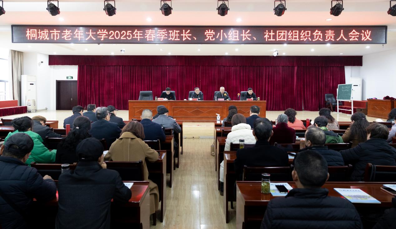 3月13日下午,桐城市老年大学2025年度新学期工作会议在多功能厅召开。各班班长,各党小组长,各专业学会负责人,艺术团、合唱团、志愿者服务队、宣传组负责人近百人参加会议。校长胡爱国,副校长吴朝阳、阮子海出席会议,会议由副校长罗德泉主持。