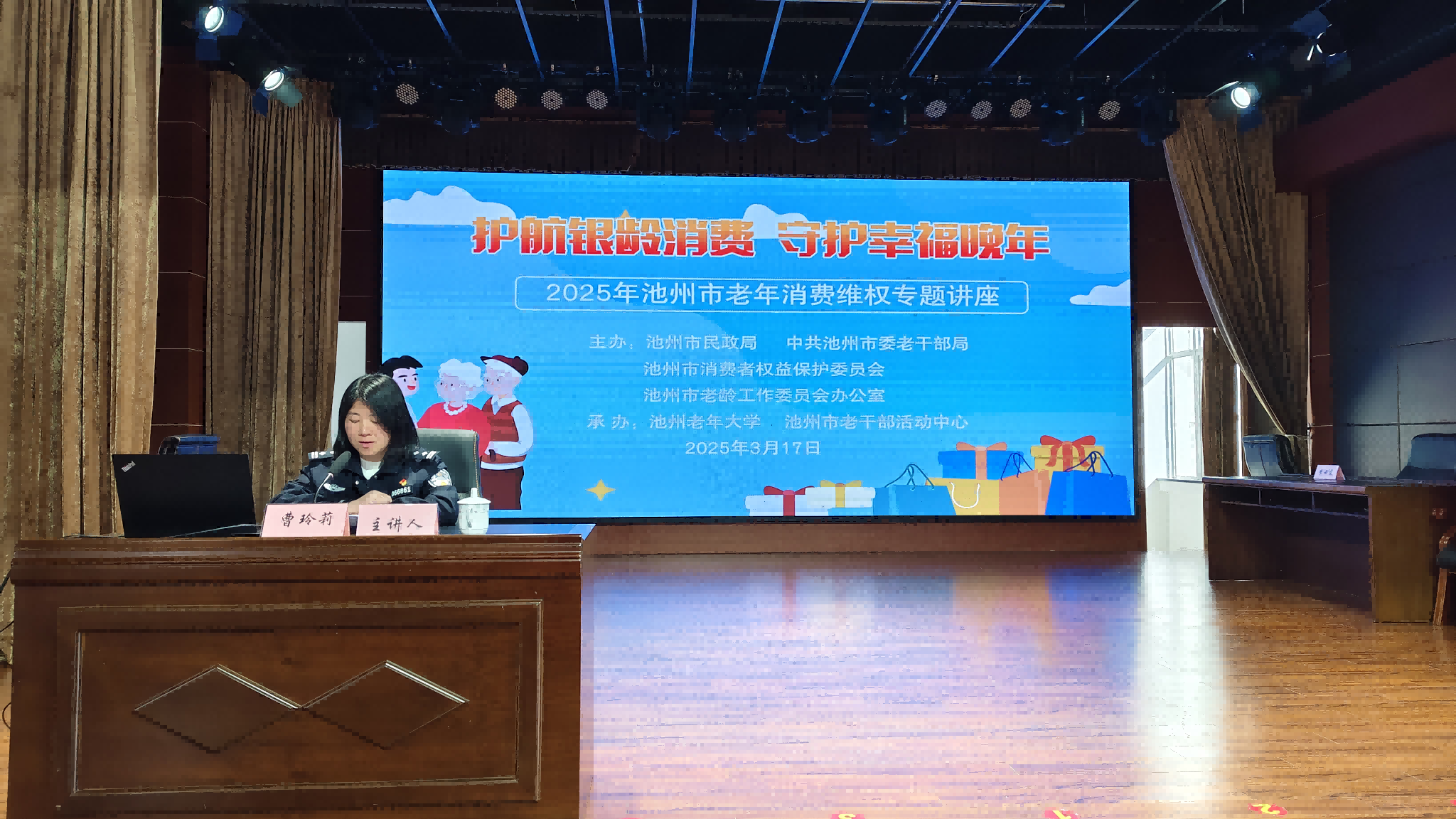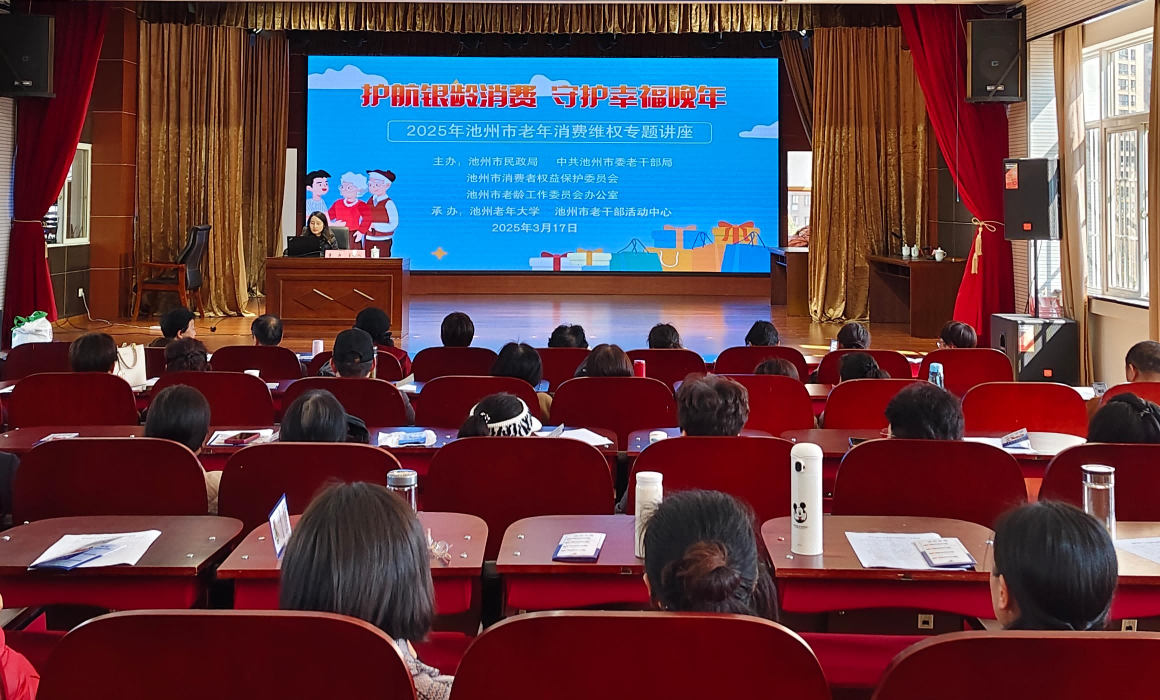 3月17日,由池州市民政局、中共池州市委老干部局、池州市消费者权益保护委员会、池州市老龄工作委员会办公室主办,池州老年大学、池州市老干部活动中心承办的“护航银龄消费 守护幸福晚年”2025年池州市老年消费维权专题讲座在池州老年大学南校区五楼多功能厅举办。池州老年大学各教学班班长近80人参加讲座。