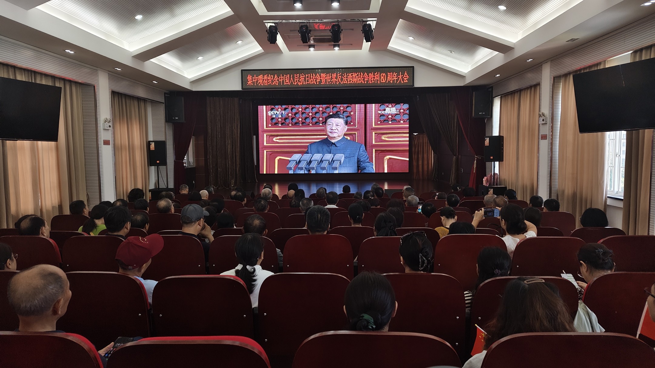 9月3日,纪念中国人民抗日战争暨世界反法西斯战争胜利80周年大会在北京天安门广场隆重举行。池州老年大学组织广大师生百余人集中观看了直播,共同回顾那段波澜壮阔的抗战历史,缅怀革命先烈的丰功伟绩。