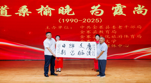 演出期间,六安市老年大学现场赠送一幅书法作品,以“赓续文脉,辉光日新”表达对金寨老年大学的良好祝愿。