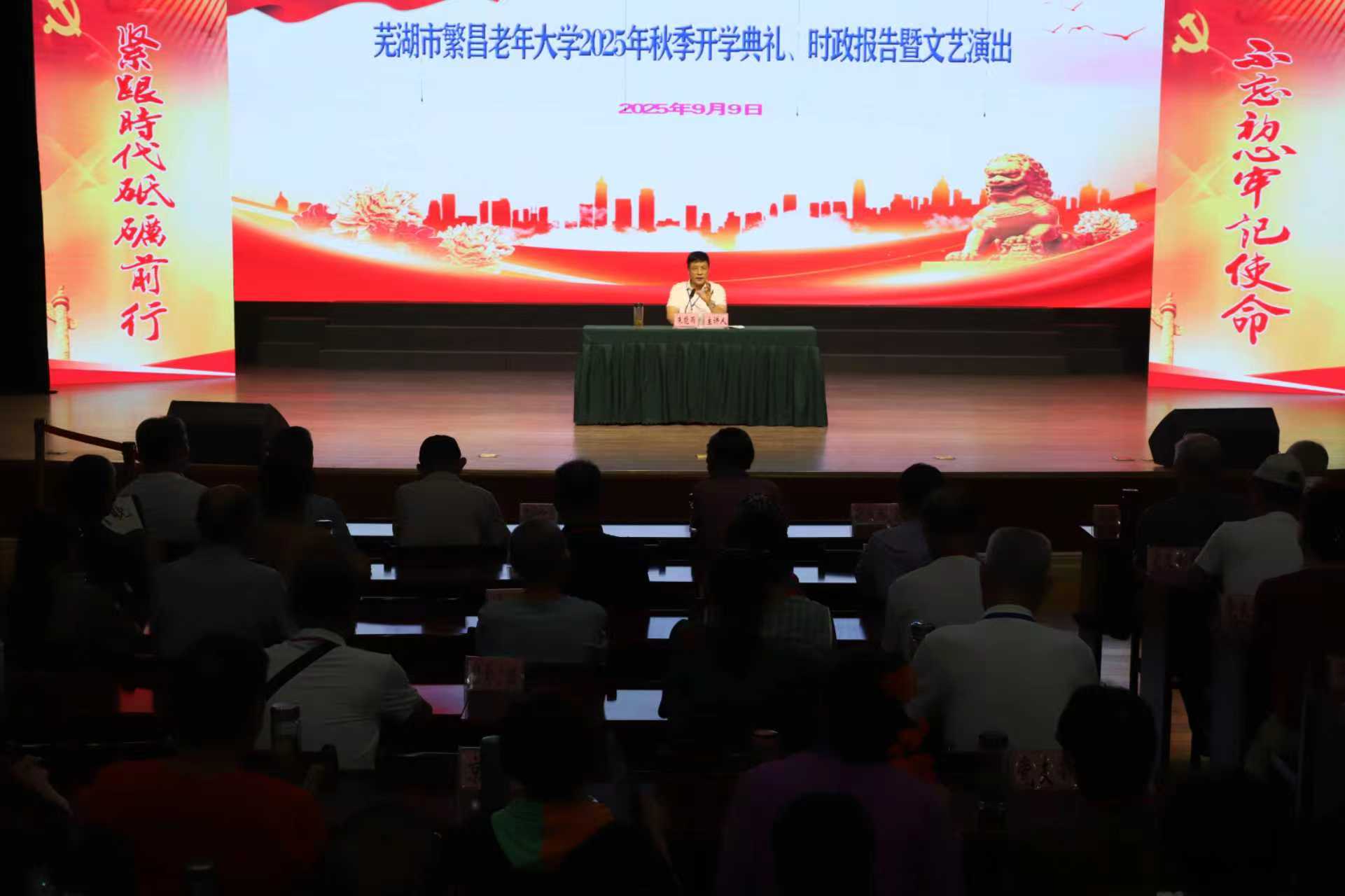 9月9日,繁昌老年大学2025年秋季开学典礼、时政报告暨文艺演出在校报告大厅隆重举行。学校领导班子、各系各班专业教师、学员干部、学员代表及相关工作人员近500人参加。