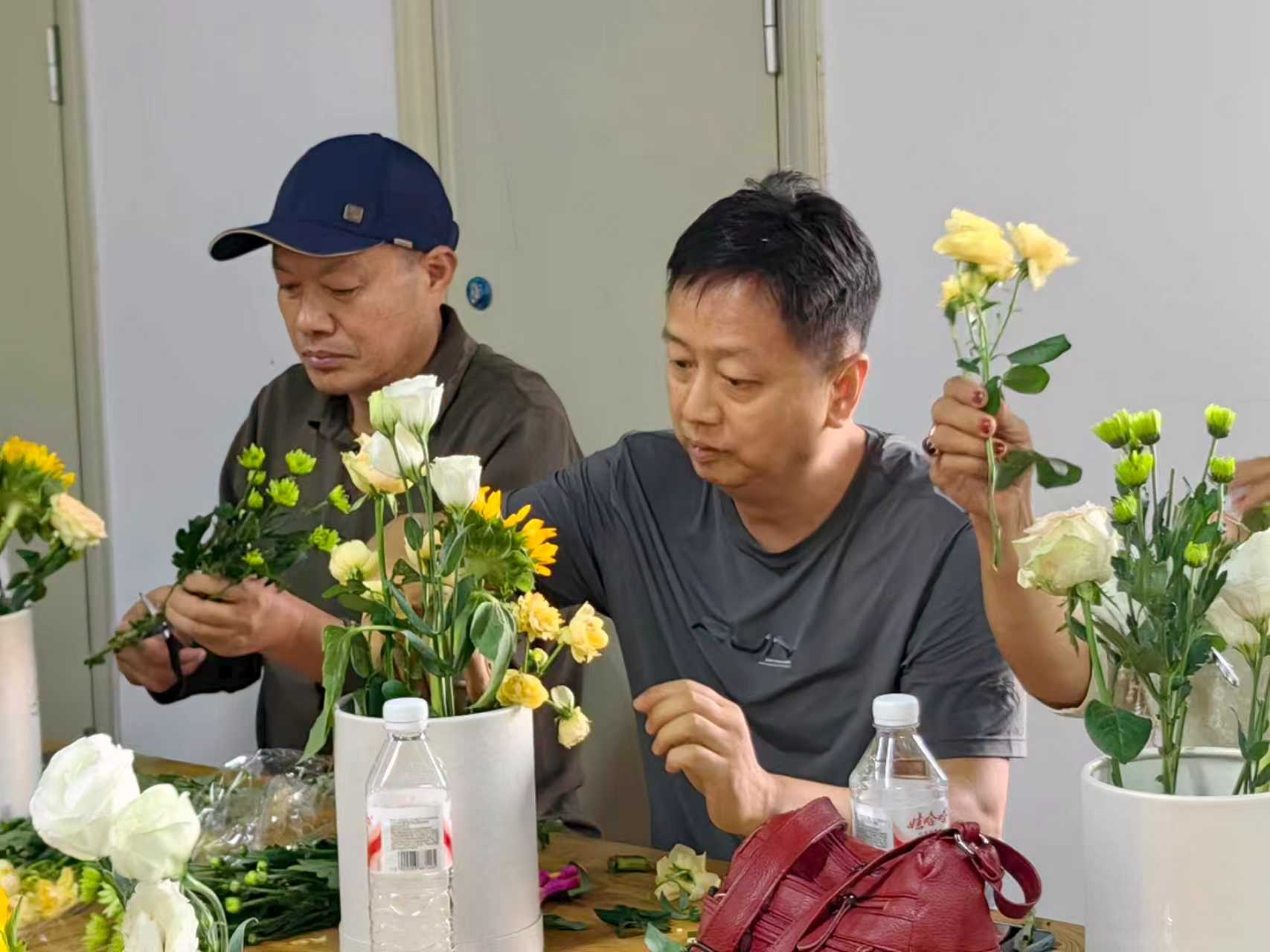 会后,插花活动随即展开。桌上香槟玫瑰、小雏菊、桔梗等花材与工具一应俱全。花艺老师从选花、配色到造型逐步讲解,示范剪枝、定位技巧。老师们穿行其间,为班长们细致答疑。