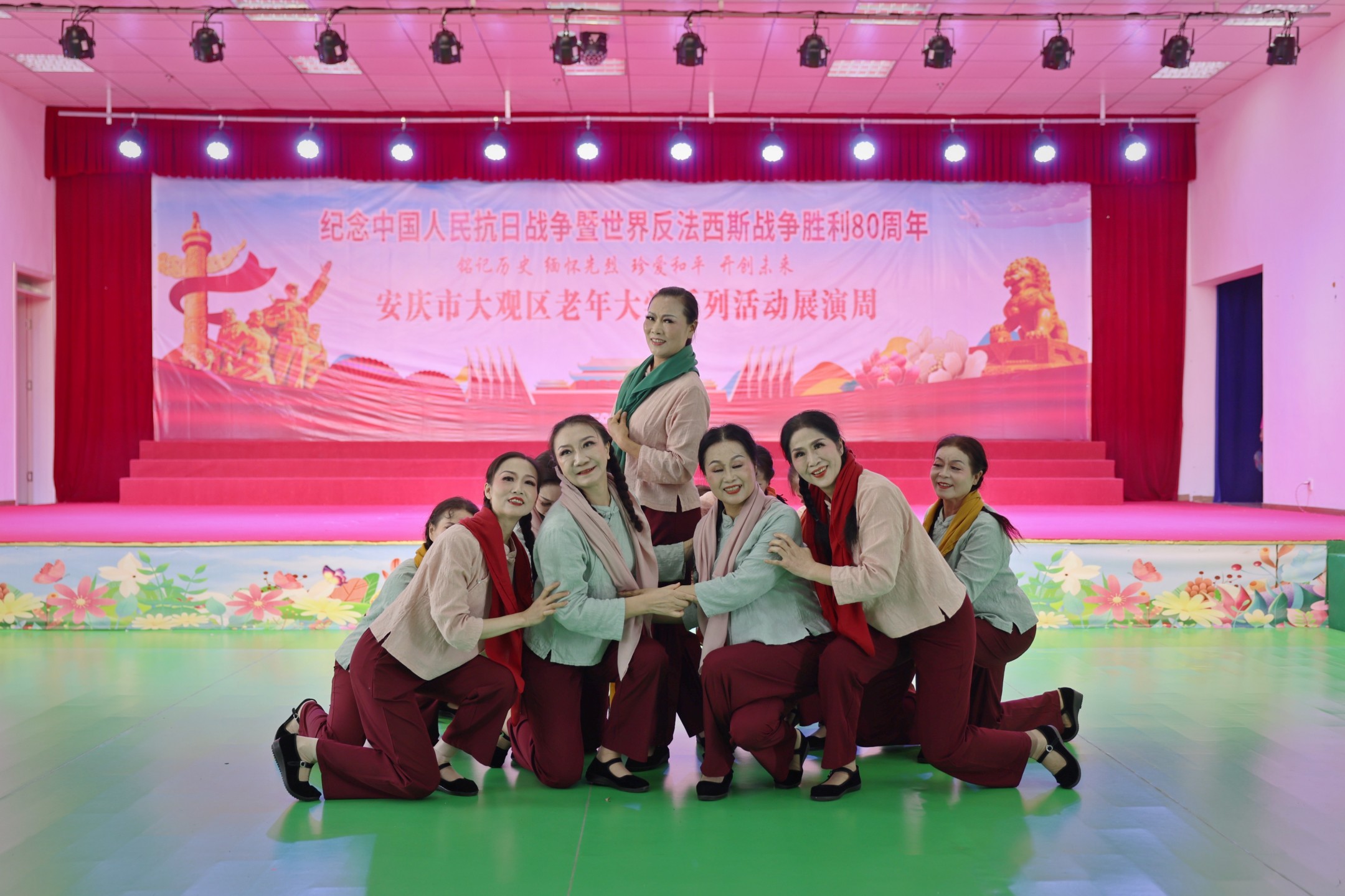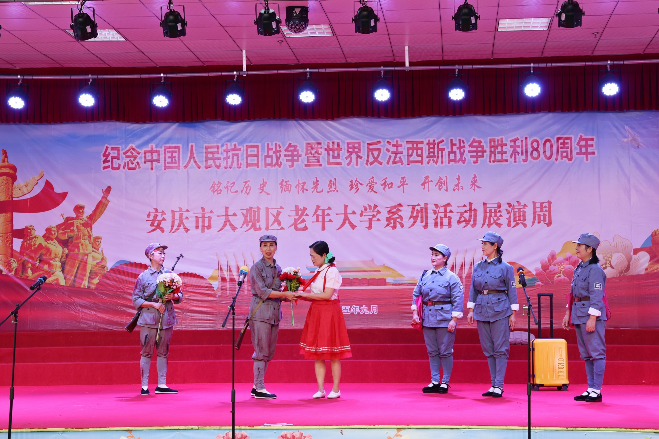 在全国各地纪念抗战胜利80周年之际,由中共安庆市大观区委组织部(老干部局)、中共安庆市大观区委宣传部主办,安庆市大观区老年大学承办,纪念中国人民抗日战争暨世界反法西斯战争胜利80 周年“铭记历史 缅怀先烈 珍爱和平 开创未来”主题文艺展演周,于9月23日下午正式拉开帷幕。活动持续至9月25日,音乐系、舞蹈系、书画系等八大教学系师生历时三个月精心打磨61个原创节目将在展演周期间展出,用银发赤忱共筑精神丰碑。
