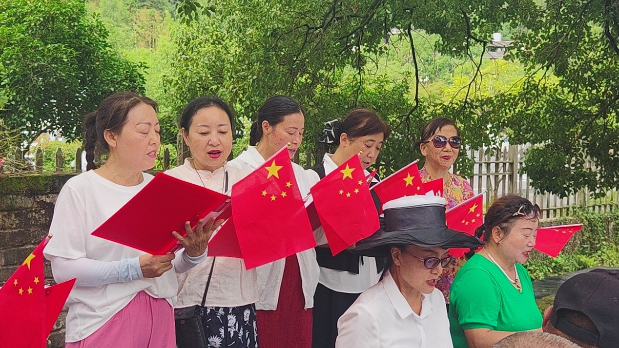 葫芦丝、电子琴和电吹管班的学员们走进黟县古城,在通济桥、新华书店长亭和北街口三个点,各显神通把《映山红》《阿佤人民唱新歌》和《我爱你中国》等歌曲展演给市民,学员们以合唱《歌唱祖国》尽情地抒发爱国情怀。