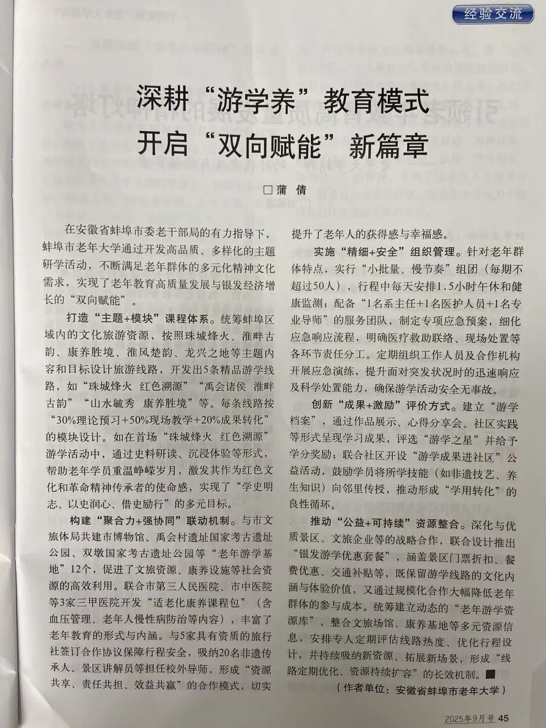 蚌埠市老年大学经验交流文章《深耕“游学养”教育模式 开启“双向赋能”新篇章》一文刊登在《老年教育》期刊。该期刊为中国老年大学协会刊,是专注于老年教育领域的核心刊物。