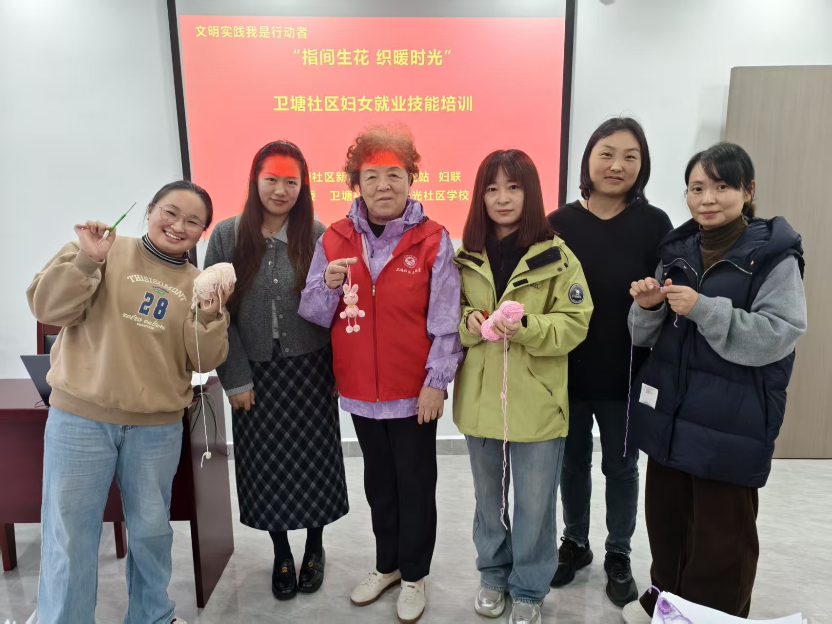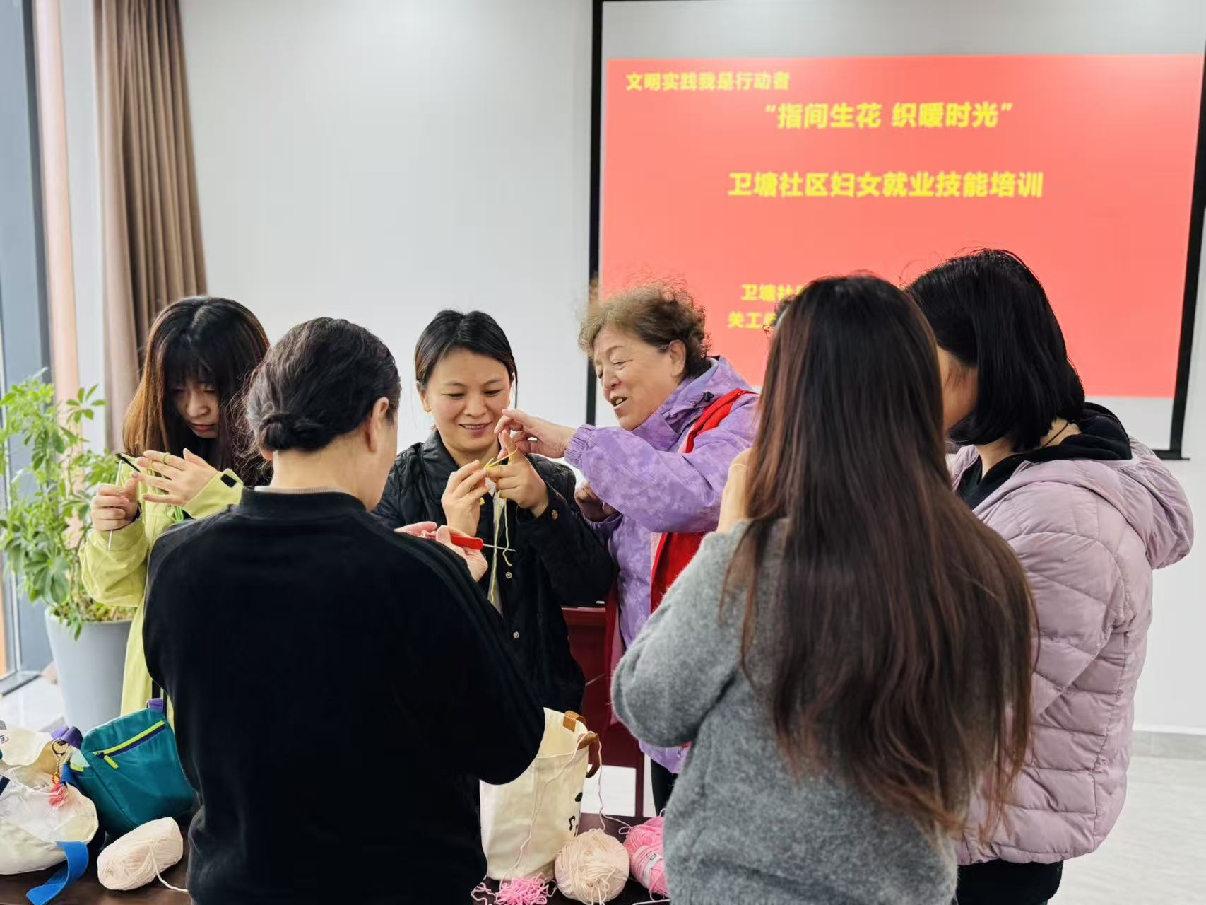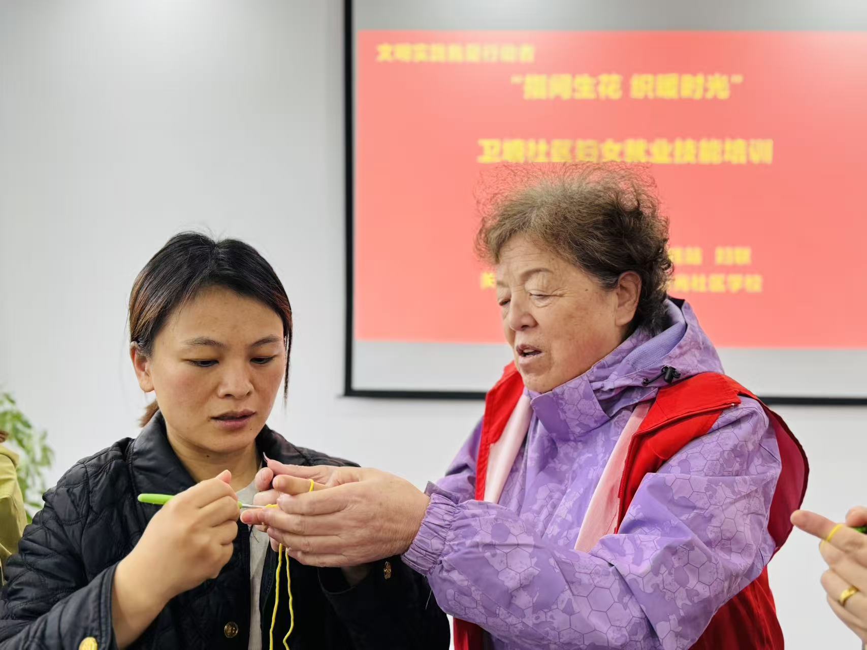 2025年10月20日下午卫塘社区周阿姨手工坊里,传出阵阵温暖的笑语。这里没有高深的讲座,也没有紧张的节奏,有的只是一团团五彩斑斓的毛线,几根灵巧的钩针,和一群围坐在一起、神情专注的美丽女性。站在她们中间,耐心讲解、俯身示范的,是满头银发却精神矍铄的周阿姨。这个由她名字命名的公益手工工作坊,正悄然成为连接邻里、传递技能与温暖的“社区绿洲”。