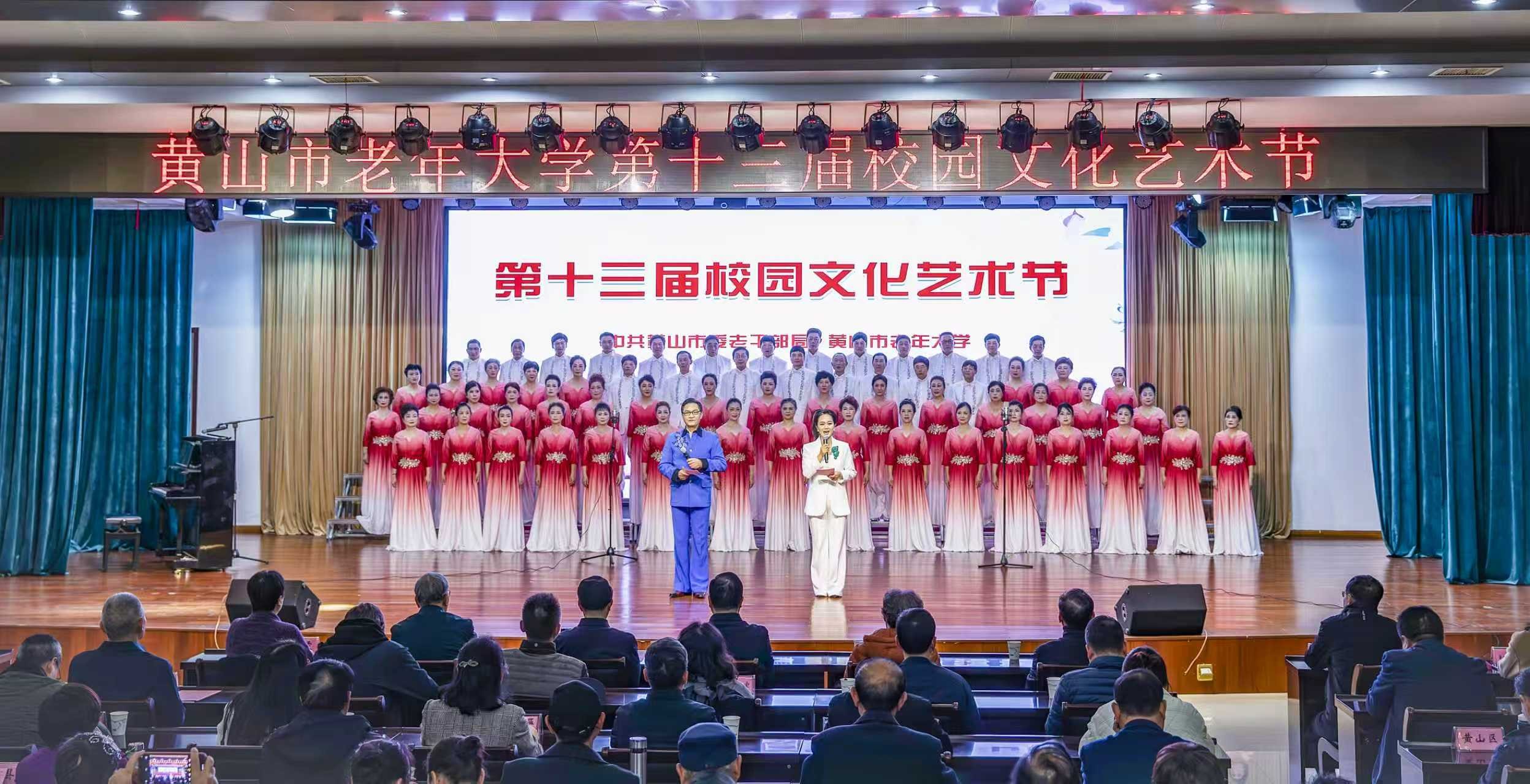 11月17日至21日举行的第十三届校园文化艺术节分两个板块:一是书画摄影诗词楹联剪纸手工制作作品展,二是文艺演出。书画摄影诗词楹联剪纸手工作品展,展出学员创作的书画110幅,摄影100幅,诗词33首,楹联17幅,剪纸手工制作作品80多件,这些作品以歌颂党、歌颂祖国、歌颂黄山、歌颂幸福晚年生活为主题,题材多样,风格各异,展现了学员们在市老年大学学习的获得感和幸福感。11月17日至20日下午,四场文艺演出演出节目81个。文艺演出在手鼓表演《中华魂》中拉开帷幕,四场演出的节目,有大合唱、舞蹈、旗袍秀、诗歌朗诵,有器乐合奏、小提琴齐奏、舞韵瑜珈,国风扇舞,还有黄梅戏表演唱、京歌演唱、身段表演、越剧表演唱等。整台文艺演出主题鲜明,气氛热烈,精彩纷呈,掌声不断,全面检阅了学校深入推进二次创业,不断提高教育教学质量取得的丰硕成果,充分展现了广大师生新时代老有所为、昂扬向上的精神风貌。