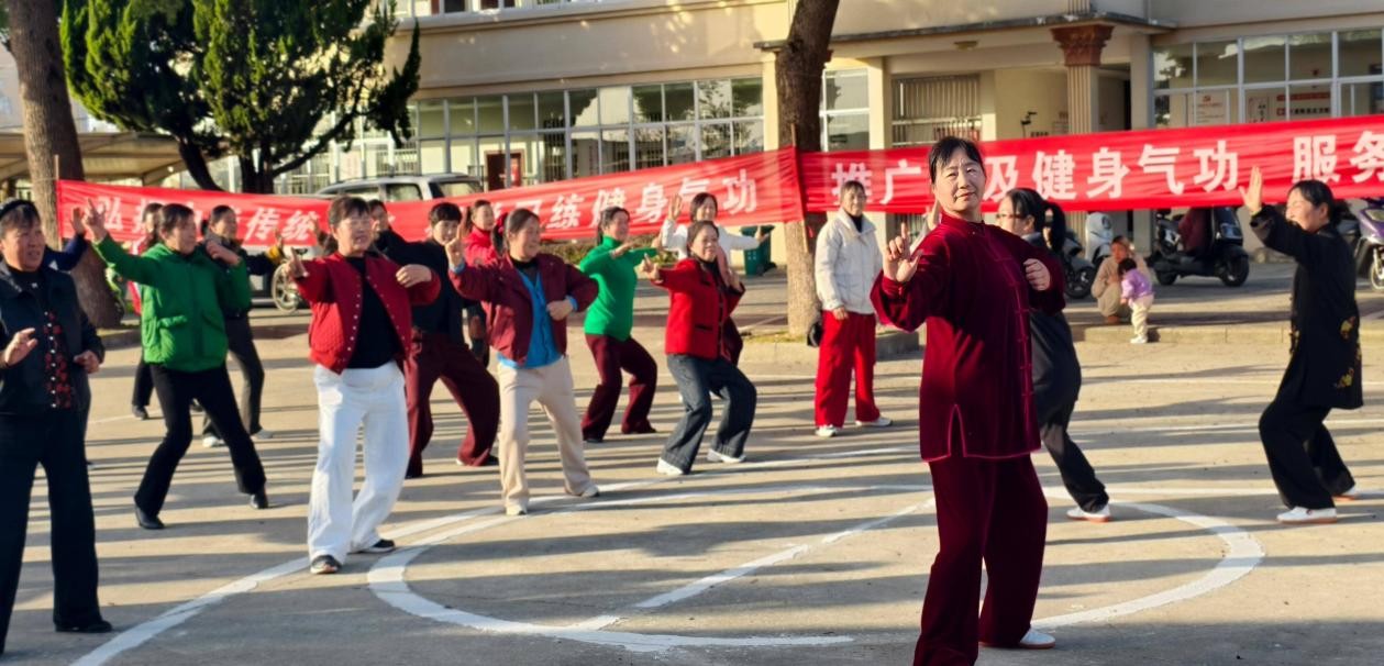 11月28日,县老年大学健身气功班教师张嬿携学员许春凤、张其玲走进乌溪镇七房村,开展"健身气功八段锦"送教活动。下午2时许,在张嬿老师详细的动作讲解与两位学员的示范下,村部广场上40余名老年学员认真跟随练习。尽管教学时间有限,多数学员掌握了八节动作的基础招式;针对动作协调困难的学员,送教团队还进行“一对一”耐心指导。课程尾声,送教老师师展演气功舞,舒展的身姿与专注的神情,构成乡村午后最动人的画面。临别时,学员们纷纷添加老师微信,搭建起长效学习交流的线上平台。