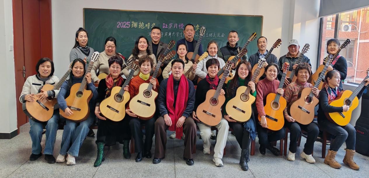 12月26日下午滁州老年大学420教室琴声悠扬、掌声阵阵,一场以“弦歌不辍 晚晴生辉”为主题的吉他班年度教学成果汇报联欢会在此温情上演。30余名平均年龄60岁的学员登台献艺,用指尖流淌的音符诠释着“活到老,学到老”的热情,为冬日校园增添了别样温暖。