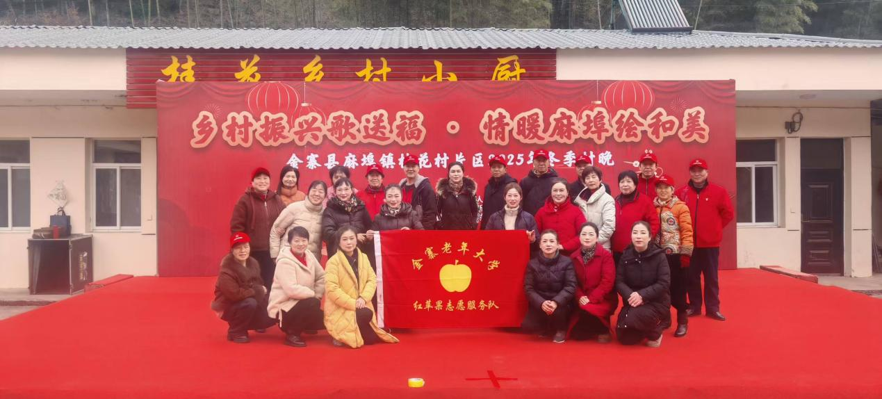 12月30日,麻埠镇桂花村冬季村晚现场人头攒动,掌声雷动。金寨老年大学副校长王琦带领老校区红苹果志愿服务队成员和学员代表共30余人,携精心编排的《红歌六联奏》《中国龙舞起来》两个节目精彩亮相。